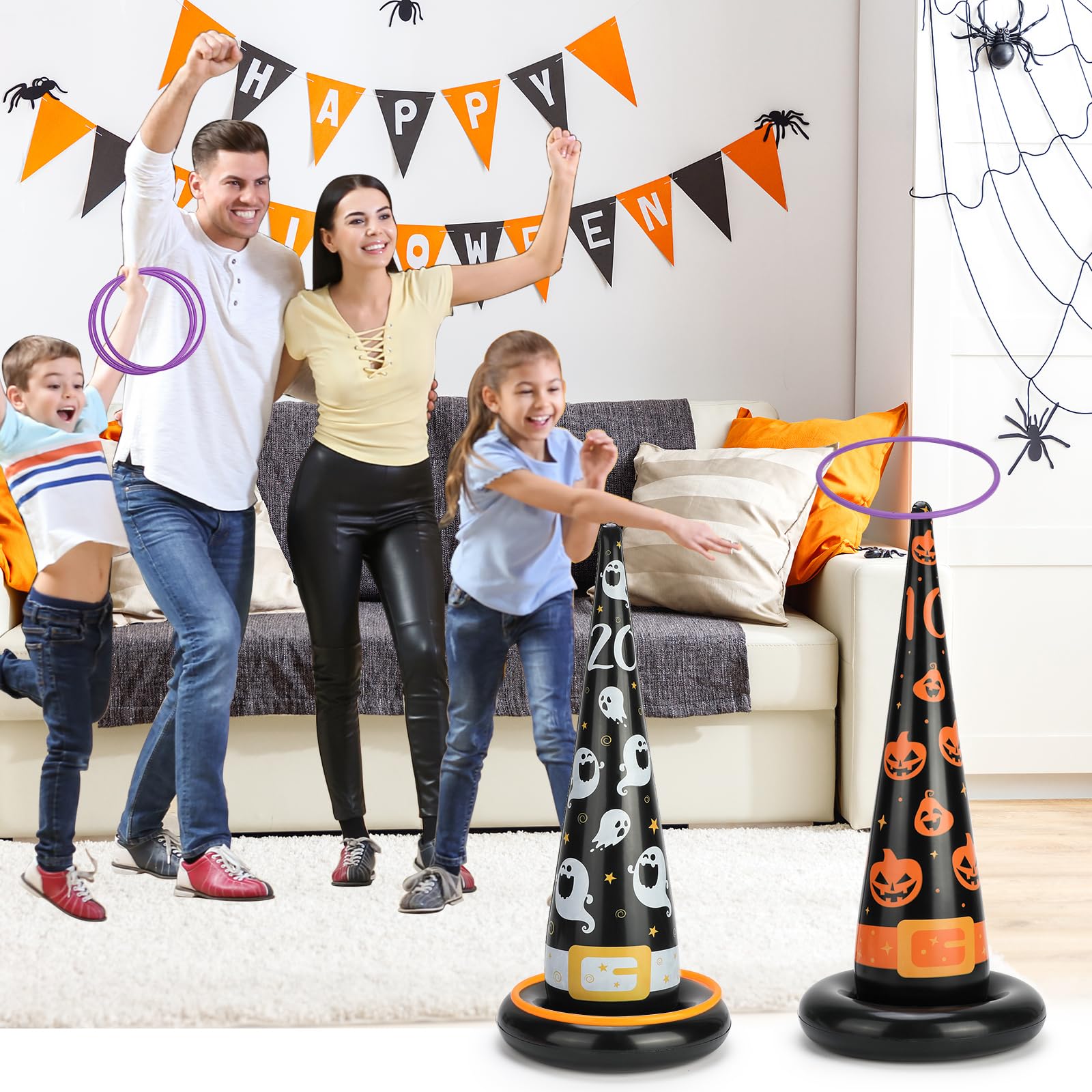 Halloween-Spaß für die ganze Familie! Unser Ringwurfspiel mit aufblasbaren Kegeln und bunten Wurfringen bringt Stimmung auf jede Party.