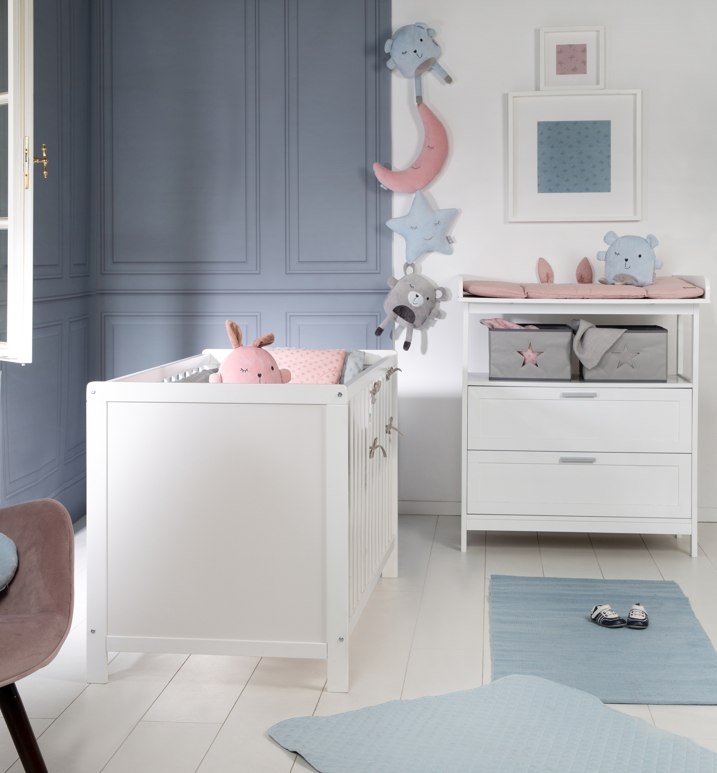 Perfektes Starter-Set fürs Babyzimmer! Dieses roba Set besteht aus einer superpraktischen Wickelkommode 'Hamburg' und einem höhenverstellbaren Beistellbett. Die Kommode hat eine angenehme Wickelhöhe von 92 cm - super rückenschonend für die Eltern! Mit 2 Schubladen und 2 Canvas-Boxen bleibt alles ordentlich und griffbereit. Später kannst du den Wickelaufsatz einfach abnehmen und hast eine normale Kommode. Das Beistellbett ist echt clever: 5 herausnehmbare Schlupfsprossen machen es zum Gitterbett oder Beistellbett (22-42 cm höhenverstellbar). Alles in schickem Weiß, Made in Germany und entspricht den Sicherheitsstandards. Maße Kommode: H100xB87xT75/40 cm, Bett: 60x120 cm Liegefläche. Einfach aufbauen und schon bist du startklar für die Babyzeit!