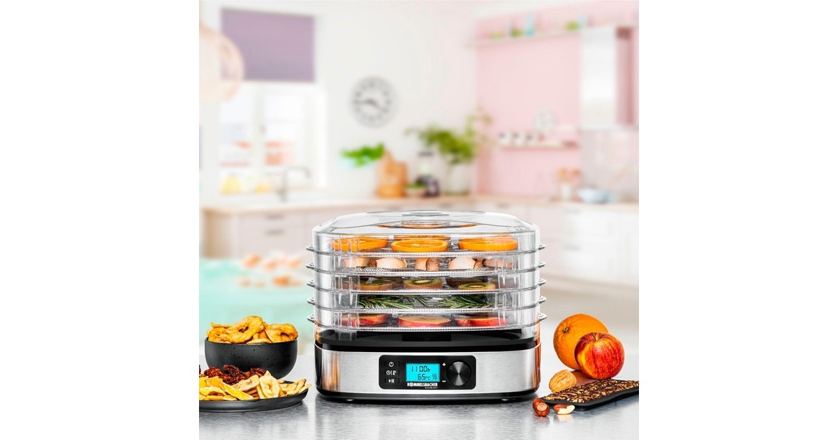 Entdecke die Welt des Dörrens mit diesem hochwertigen Dörrautomaten von Rommelsbacher! Mit 5 Edelstahl-Dörrtabletts und einer Gesamtfläche von 0,2m² hast du genug Platz für Obst, Gemüse, Kräuter oder sogar selbstgemachte Müsliriegel. Die Temperatur lässt sich präzise zwischen 35°C und 80°C einstellen - perfekt für schonendes Dörren bei niedrigen Temperaturen oder schnelleres Arbeiten. Der 99-Stunden-Timer und die Warmhaltefunktion machen das Dörren zum Kinderspiel. Besonders praktisch: Die LED-Innenbeleuchtung und das spülmaschinenfeste Zubehör. Mit den mitgelieferten Müsli-Formen kannst du sogar gesunde Snackriegel herstellen. Energiesparend und leise - ideal für gesunde Ernährung!