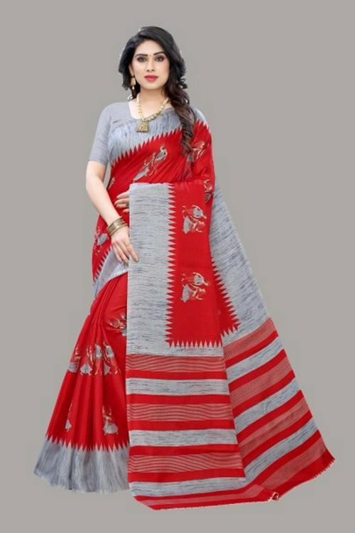 Yashika Damen Banarasi Sari Rot - Baumwoll-Seide Sari Mit Blusenmaterial Für Feste