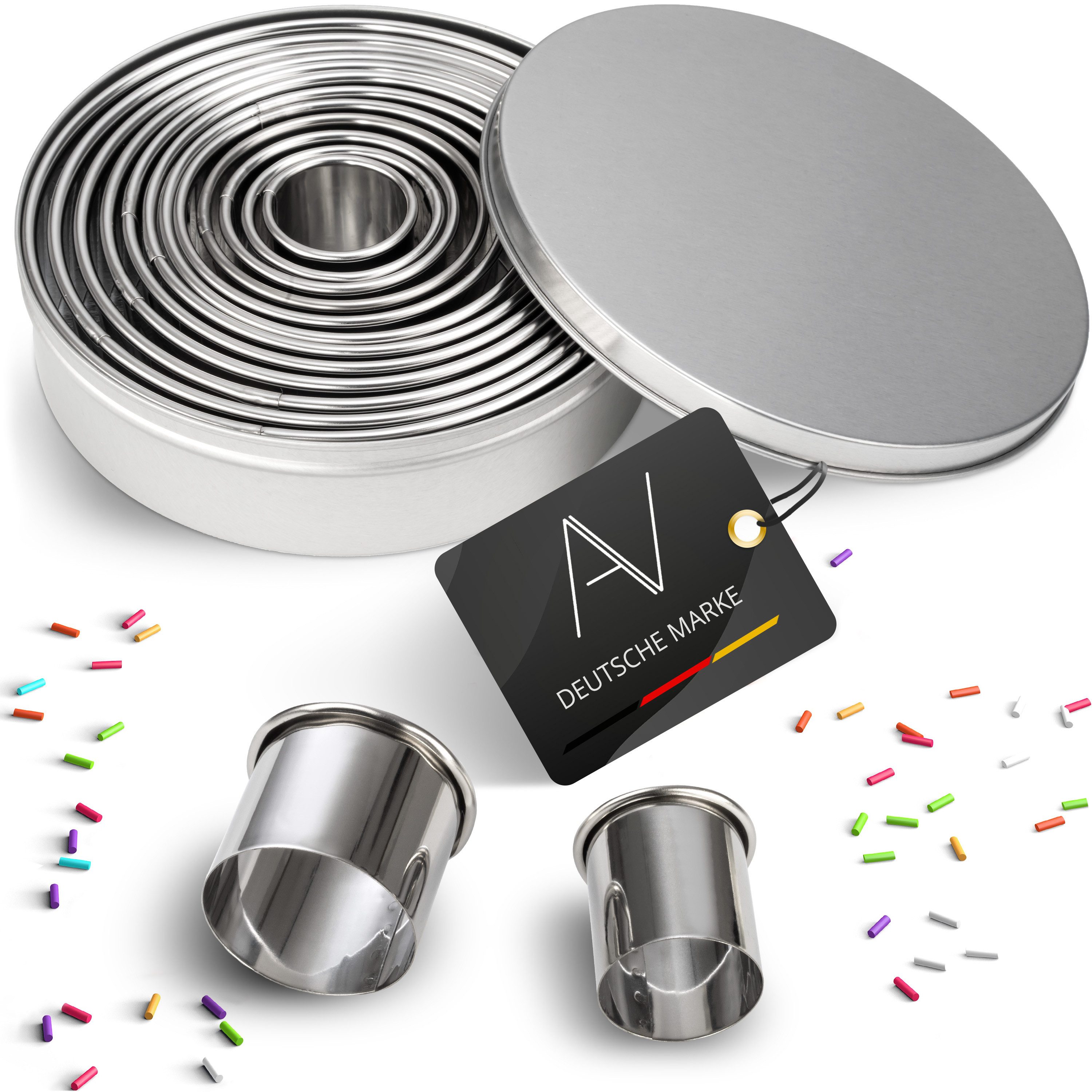 Backen macht mit diesem 6-teiligen Ausstecher-Set noch mehr Spaß! Aus hochwertigem Edelstahl gefertigt, sind die runden Formen in verschiedenen Größen von 5,2cm bis 15,5cm perfekt für Plätzchen, Scones, Donuts oder Tortenböden. Der gebördelte Rand liegt gut in der Hand und ist auch für Kinder sicher. Die glatte Oberfläche ermöglicht ein leichtes Reinigen - sogar spülmaschinengeeignet! Besonders praktisch: Die Ausstecher sind stapelbar und nehmen kaum Platz in der Schublade weg. Ob für Weihnachtsbäckerei, Geburtstagstorten oder kreative Desserts - mit diesem Set gelingen dir gleichmäßige, saubere Ergebnisse. Auch als Servierringe fürs Anrichten super geeignet. Ein Must-Have für jede Backstube!
