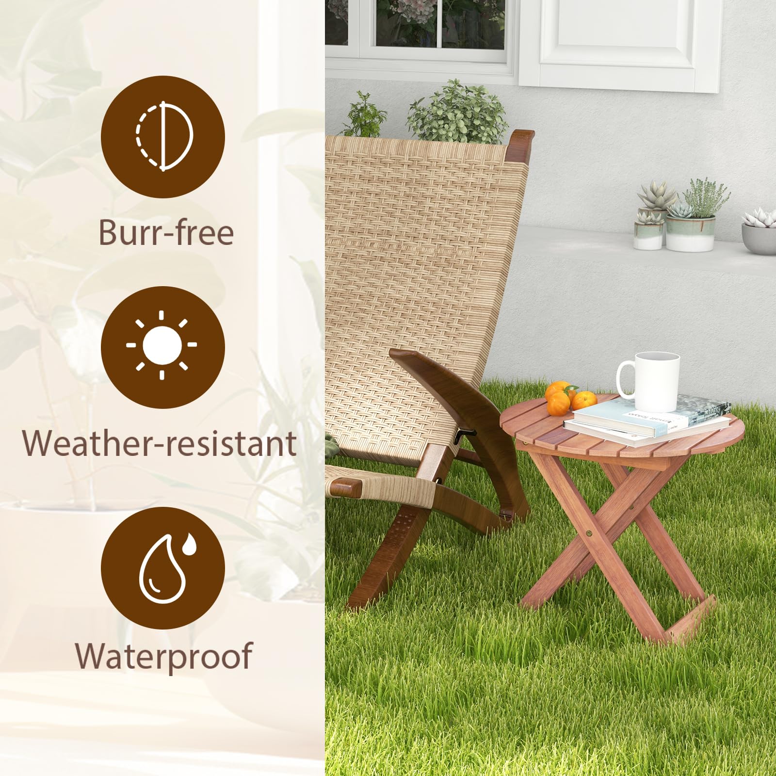Dieser faltbare Beistelltisch aus Akazienholz ist einfach genial! Mit 46cm Durchmesser und 45cm Höhe passt er perfekt neben jeden Gartenstuhl. Die stabile X-Struktur hält bis zu 75kg aus - absolut standfest! Aus massivem Akazienholz mit schöner Maserung, fein geschliffen und gratfrei. Das Lattenrost-Design verhindert Wasseransammlungen und macht die Reinigung super einfach. Einfach die Beine ausklappen, mit den Ringklammern fixieren - und schon kann's losgehen! Mit praktischem Griff zum leichten Transport. Wenn nicht gebraucht, klappst du ihn auf nur 5cm Höhe zusammen - platzsparend verstaut! Perfekt für Garten, Terrasse, Balkon, aber auch im Wohnzimmer oder Büro. Tipp: Nicht dauerhaft in Sonne oder Regen stehen lassen, dann hält er ewig! Natur pur für dein Zuhause!