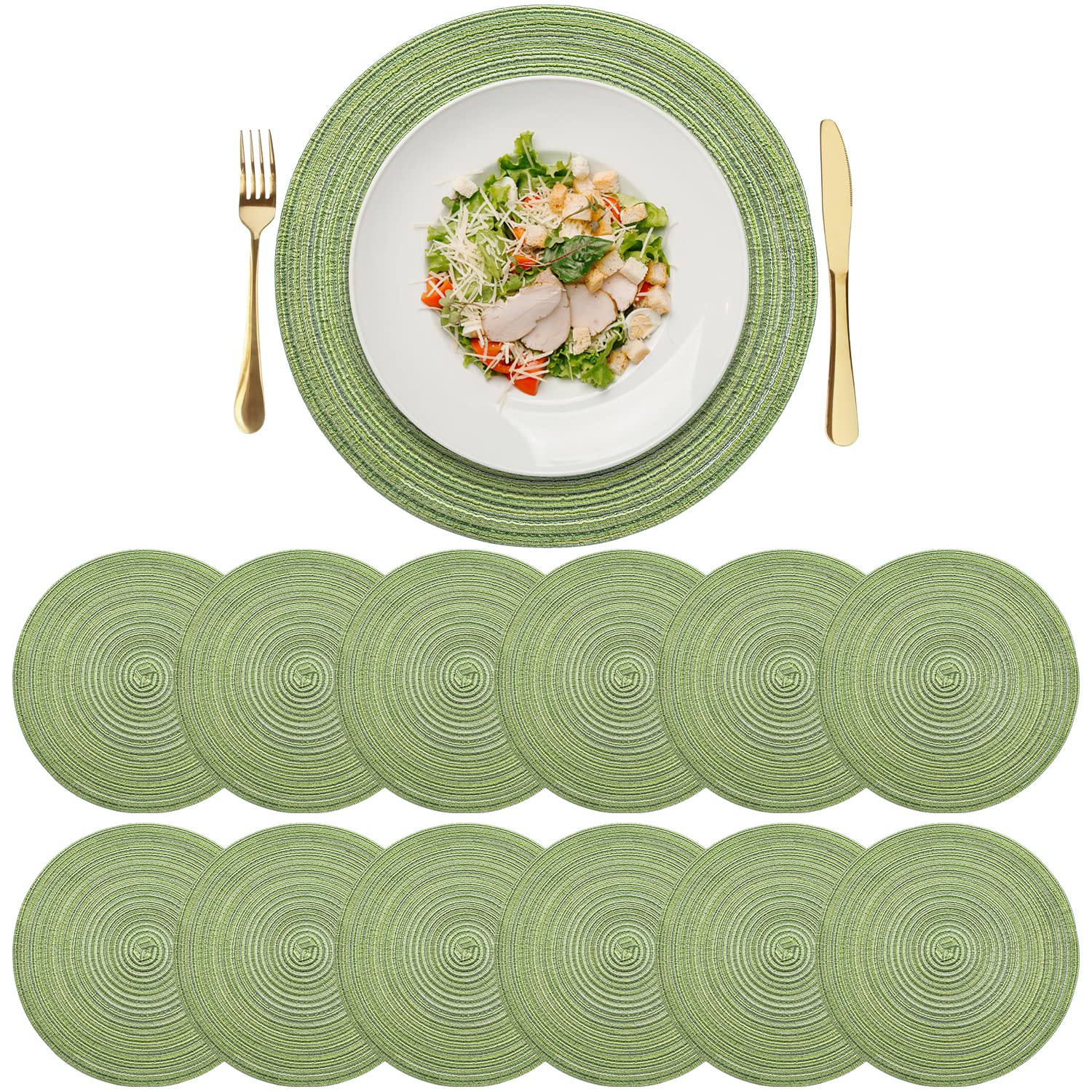 Hey, willst du deinen Esstisch vor lästigen Kratzern und Flecken schützen? Diese süßen runden Tischsets von Ciieeo sind genau das Richtige! Im 2er-Set mit je 40 cm Durchmesser bieten sie genug Platz für Tassen, Teller und Schüsseln. Die grüne Farbe und das moderne Webdesign sehen nicht nur gut aus, sondern passen auch zu den meisten Einrichtungsstilen. Aus hochwertigem, strapazierfähigem Material gefertigt, sind sie langlebig und halten lange. Stell dir vor: Deine Gäste kommen zu Besuch und bewundern deine schöne Tischdekoration! Diese isolierten Matten schützen nicht nur deine Möbel, sondern sind auch ein echter Hingucker. Perfekt für zu Hause, im Café oder Restaurant - überall dort, wo Tische geschützt werden müssen. Einfach unter Tassen, Teller oder Schüsseln legen und schon ist dein Tisch sicher. Das natürliche Material ist nicht nur umweltfreundlich, sondern auch besonders langlebig. Ob zum Frühstück, Mittag- oder Abendessen - diese Tischsets sind immer praktisch. Und sie machen sich super als Geschenk zur Einweihungsparty oder zum Geburtstag! Deine Freunde werden begeistert sein. Also, worauf wartest du noch? Mach deinen Tisch noch heute schöner und geschützter!