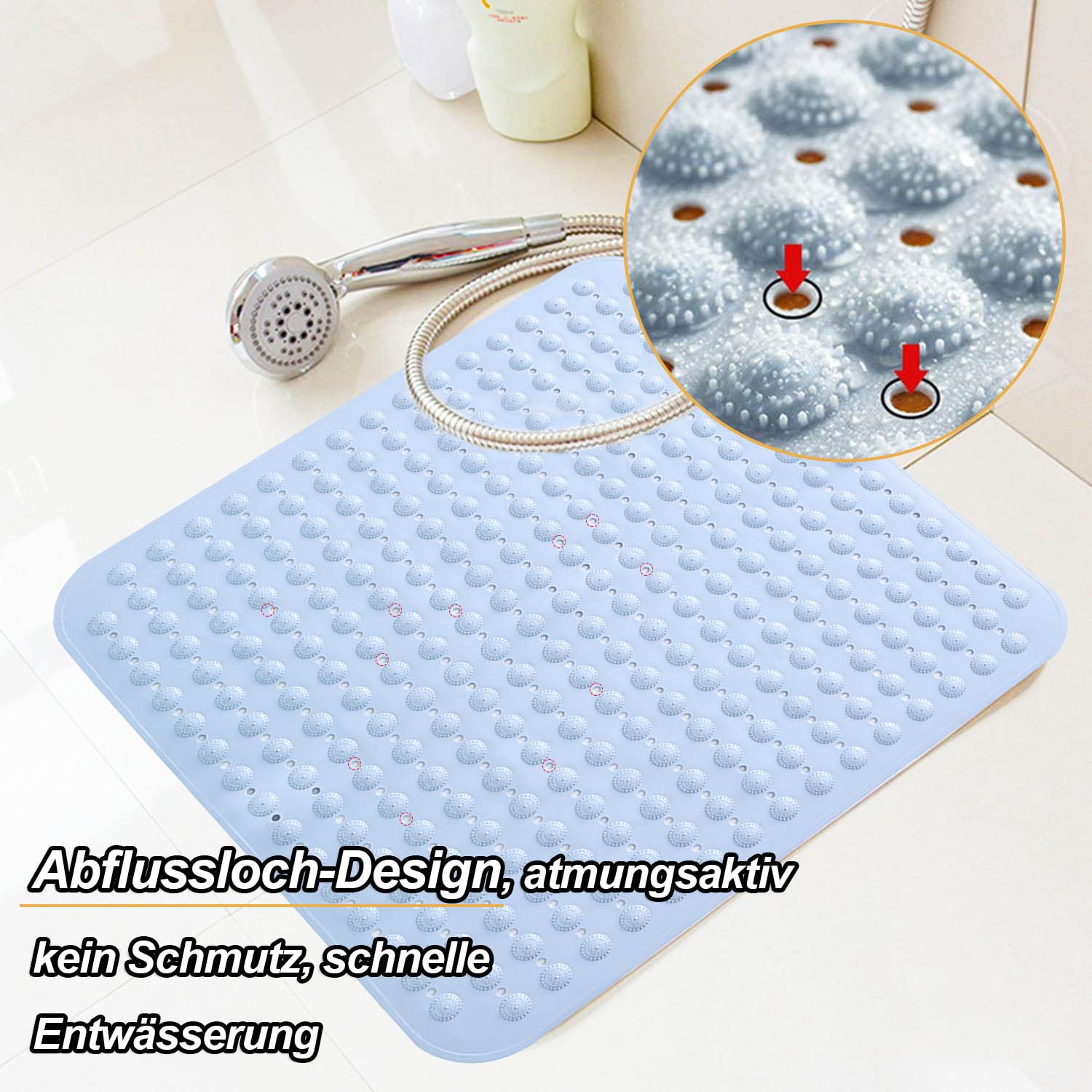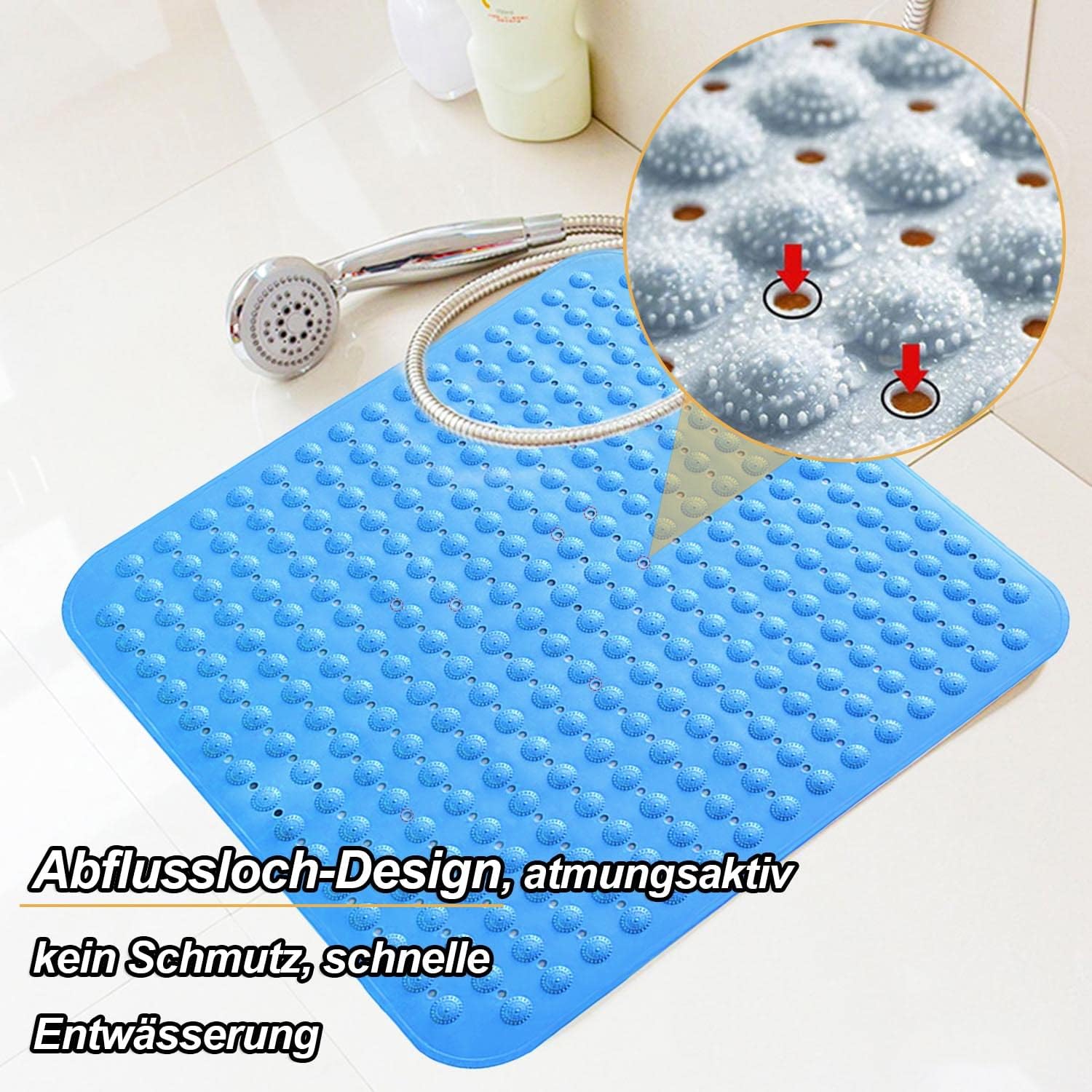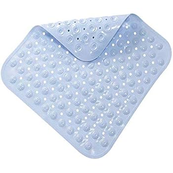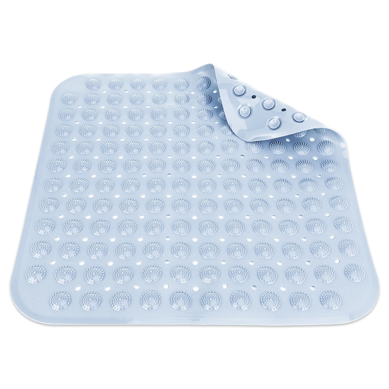 Sicherheit und Komfort in deinem Badezimmer! Diese praktische Duschmatte in Hellblau misst 48x48 cm und bietet mit ihren vielen Saugnäpfen auf der Unterseite absolut rutschfesten Halt. Die erhabenen Massageblasen auf der Oberseite sind nicht nur bequem, sondern massieren auch sanft deine Füße. Aus weichem, langlebigem PVC, das sich nicht verformt und super pflegeleicht ist. Die speziellen Ablauflöcher sorgen für schnelles Trocknen und verhindern Schmutzansammlungen. Nach dem Duschen einfach an die Wand hängen zum Trocknen oder in der Maschine waschen. Perfekt nicht nur für zu Hause, sondern auch für Hotels, Fitnessstudios, Saunen oder Krankenhäuser. Gefaltet nur 27x24,7 cm groß - platzsparend zu verstauen. Mit 465 g angenehm leicht, aber dennoch stabil.