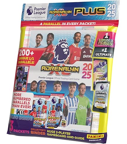 Fußball-Fans aufgepasst! Die neue Premier League Adrenalyn XL 2025 Edition ist da - und sie ist mega! In dieser Mega-Dose findest du 7 Packungen plus 1 limitierte Karte und 1 Ultimate-Karte. Jede Packung hat 8 Karten inklusive einem Parallel - brandneu diese Saison! Es gibt Golden Ballers, spezielle Kartenkategorien und ultra-seltene nummerierte Diamantfolien-Versionen. Perfekt für Sammler und Tauschfreunde. Starte deine Sammlung oder erweitere sie mit den aktuellen Stars der Premier League. Suchtfaktor garantiert!