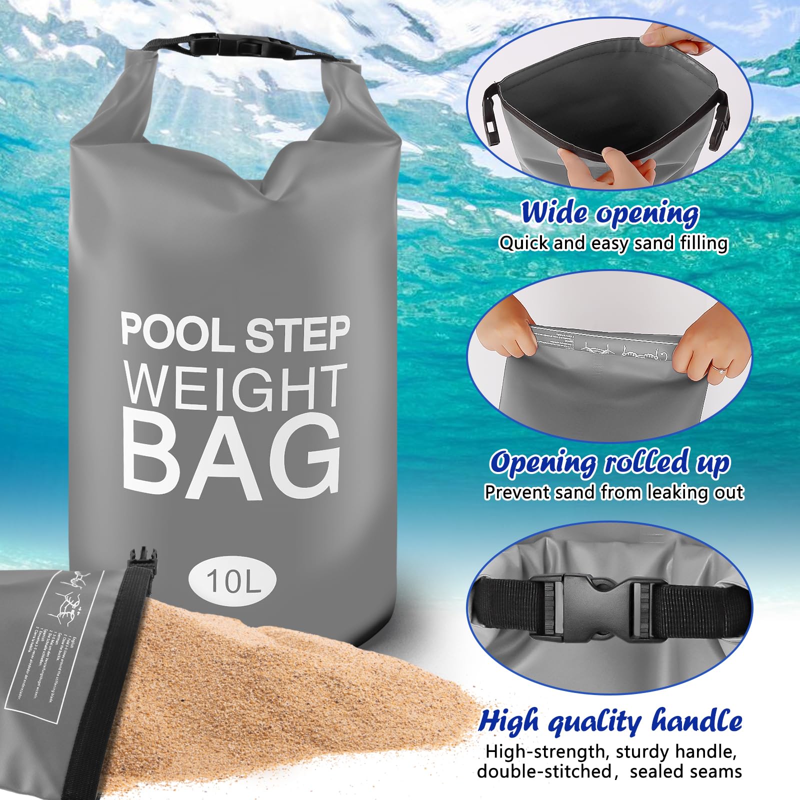 Einfach mit Sand oder Erbsenkies füllen, zurollen und an der Leiter befestigen. Passt für die meisten Pooltreppen. Auch als Trockentasche für Outdoor-Aktivitäten nutzbar!