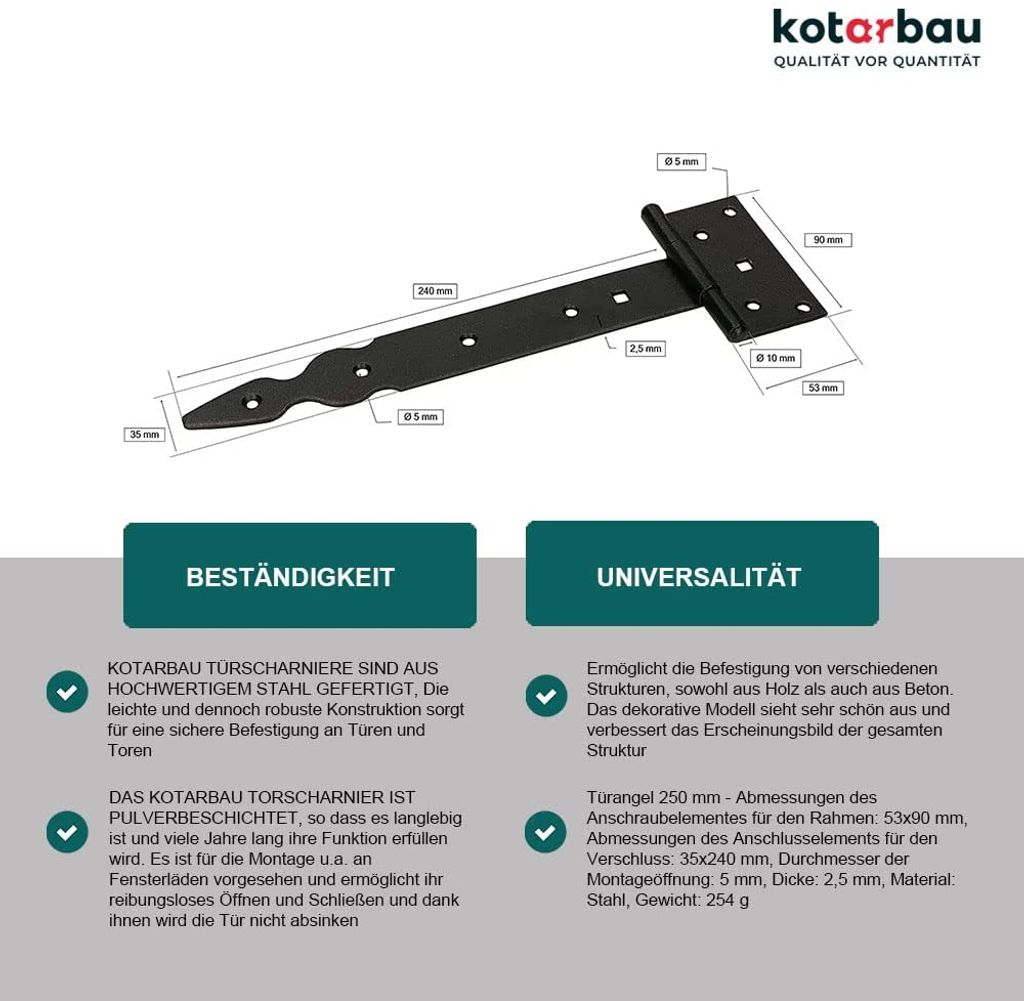 Richtig robuste Scharniere für deine Outdoor-Projekte! Diese 2 T-Scharniere sind feuerverzinkt und schwarz pulverbeschichtet - halten also auch bei schlechtem Wetter super. Perfekt für Zauntore, Gartenpforten, Kisten oder Möbel. Mit 100mm Bandlänge und 145mm Gesamtlänge, 2,3mm Materialstärke - das hält was aus! 6 Bohrungen (Durchmesser 6mm) für sichere Befestigung. Jedes Scharnier wiegt 200g - richtig massiv verarbeitet. Ob im Garten, Hof oder Werkstatt - damit gehen deine Tore und Klappen nie wieder kaputt. Einfach montieren und jahrelang Freude haben!