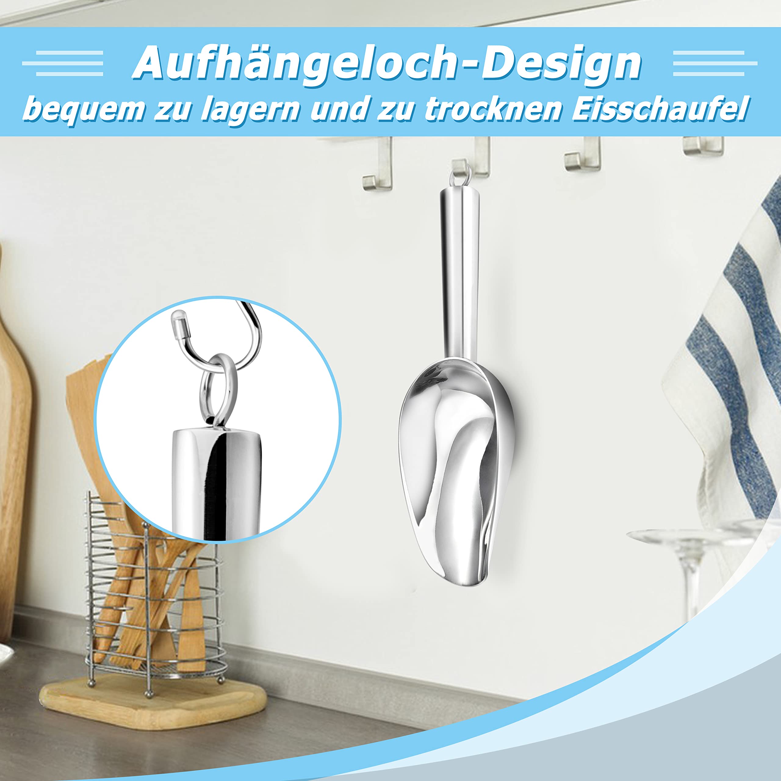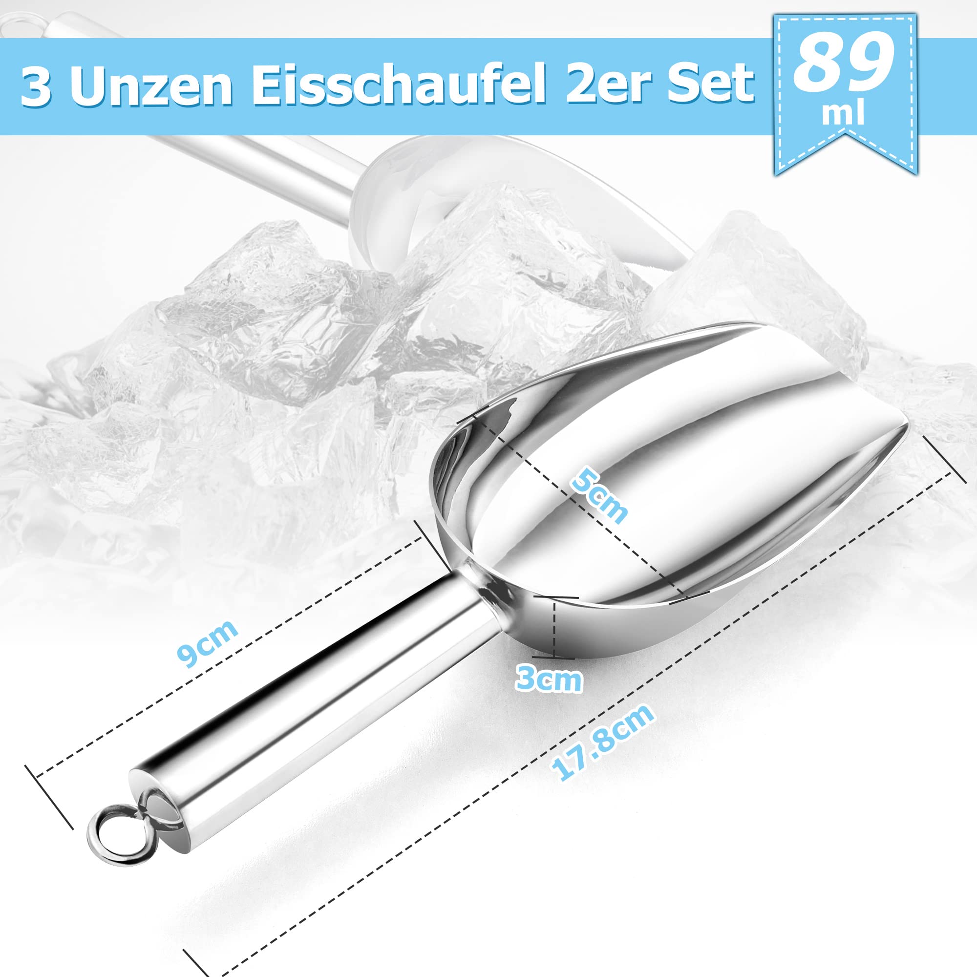 Zwei Schaufeln, die in jeder Küche und Bar Gold wert sind! Aus hochwertigem Edelstahl - rostfrei, ungiftig und super hygienisch! Perfekt für Eiswürfel, Mehl, Zucker, Kaffee oder Süßigkeiten. Der leicht gekrümmte Löffelkopf macht das Schaufeln super einfach - nichts fällt daneben! Mit 21 cm Länge und 5 cm Breite ist die Schaufel ideal für die Hand, und der Aufhängering am Ende sorgt für platzsparende Aufbewahrung. Die polierte Oberfläche ist glatt und lässt sich super leicht reinigen - einfach unter Wasser abspülen oder in die Spülmaschine stecken! Egal ob du in der Küche backst, an der Bar cocktails mixst oder Haustierfutter abmisst - diese Schaufeln sind immer die richtige Wahl! Besonders praktisch fürs Abwiegen von Zutaten oder Portionieren von Lebensmitteln. Macht sich auch super als Geschenk für Hobbyköche oder Barkeeper! Robust, langlebig und vielseitig - genau das, was du für deinen Haushalt brauchst! Einfach ausprobieren und staunen, wie oft du sie benutzt!