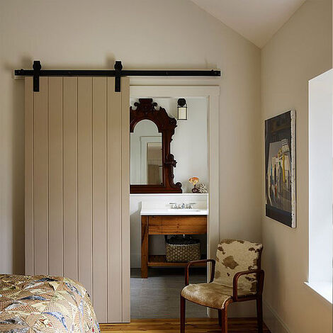 Alter, dieses Scheunentür-Set ist die Lösung für alle Platzprobleme! Statt einer lästigen Schwingtür, die immer im Weg steht, schiebst du die Tür einfach elegant zur Seite. Perfekt für kleine Küchen, Badezimmer oder Arbeitszimmer, wo jeder Zentimeter zählt. Das Schienenset aus robustem Kohlenstoffstahl hält was aus, und die eingebauten Lager sorgen für ein super leichtes Gleiten. Der klassische Haken in Schwarz sieht richtig edel aus und gibt der Tür den typischen Scheunentür-Charme. Praktisch: Es gibt keine untere Radvorrichtung, das macht die Reinigung total einfach und ist obendrein noch feuchtigkeitsbeständig. Der Anschlag verhindert, dass die Tür aus der Schiene springt und dämpft gleichzeitig den Aufprall. Wenn du also eine Türöffnung hast, wo eine normale Tür einfach unpraktisch wäre, ist dieses Set genau das Richtige. Einbau ist simpler als man denkt - und das Ergebnis sieht aus wie beim Profi!