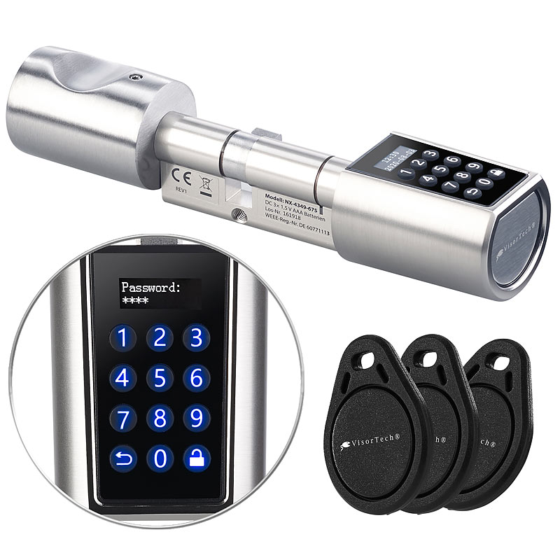 Schlüssel adé! Dieser VisorTech Smart Lock macht Schluss mit Schlüssel suchen. Öffne deine Tür per Code, Transponder oder App. Speichert bis zu 200 Zugänge - perfekt für Familie, Freunde oder Mieter. Mit Display für Batteriestand, Uhrzeit und Einstellungen. Inklusive 3 Transponder und 2 Ersatzschlüssel. Bluetooth 4.0 für App-Verbindung. Wetterfest IP55 - für innen und außen geeignet. Für Türen mit 60-90mm Stärke. Bis zu 10 Millionen Schließvorgänge - extrem langlebig. Einfache Installation - passt in bestehende Türbeschläge. Mit optionalem WLAN-Gateway auch von unterwegs steuerbar. 7 Sprachen verfügbar. Perfekt für Zuhause, Ferienwohnung oder Büro. Einfach installieren und sich über modernen Komfort freuen. Nie wieder vor verschlossener Tür stehen!