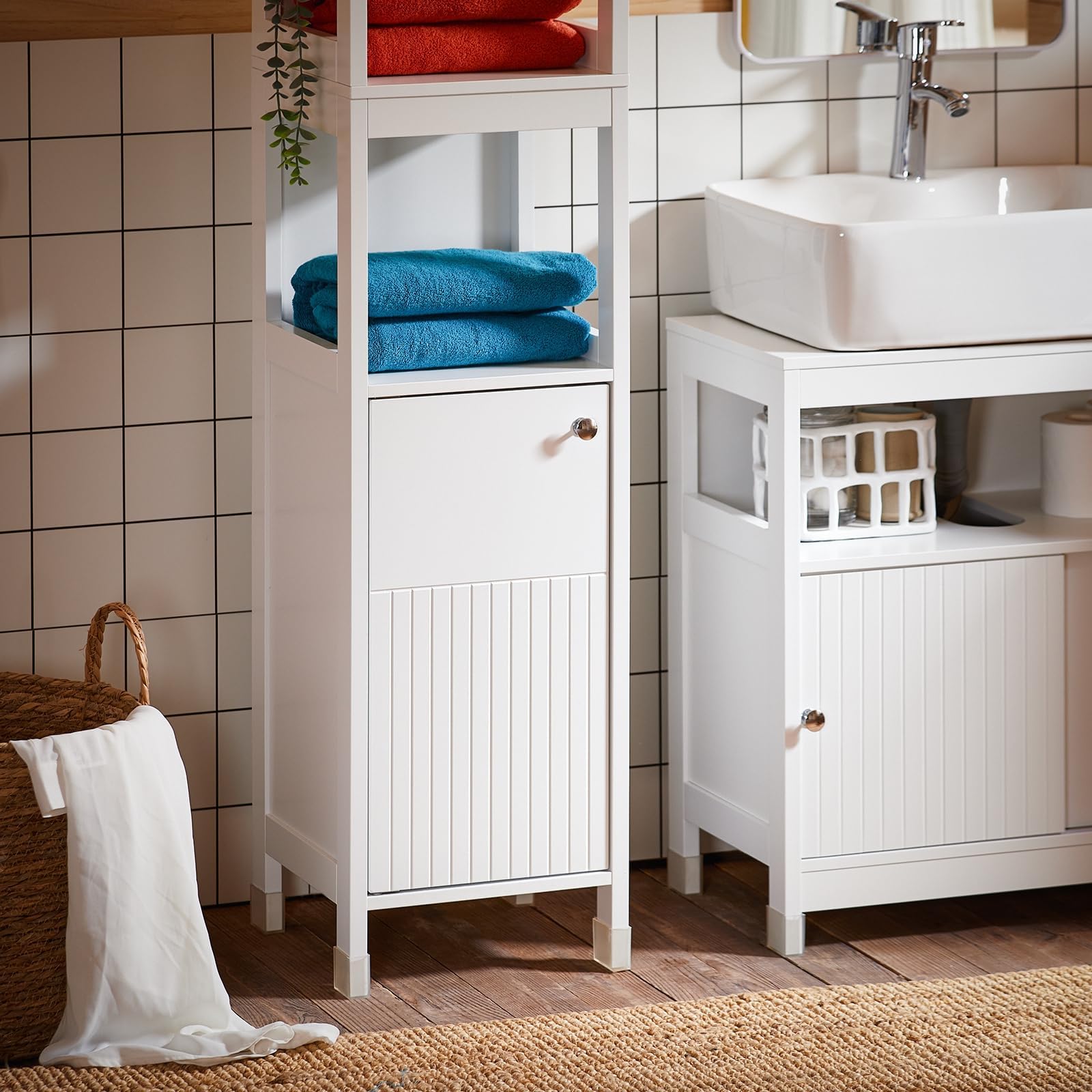 Perfekt für kleine Bäder! Dieser schmale Badezimmerschrank von SoBuy ist mit nur 21cm Tiefe die ideale Lösung für enge Nischen neben Toilette oder Badewanne. Mit den Maßen 50x21x86cm findet er selbst im kleinsten Bad noch Platz und bietet trotzdem jede Menge Stauraum.\n\nDas clevere Design hat alles, was du brauchst: Ein ergonomischer Toilettenpapierhalter für einfachen Zugriff, ein 21cm breites Fach für die Toilettenbürste und mehrere höhenverstellbare Einlegeböden für Reinigungsmittel, Pflegeprodukte und Ersatz-Toilettenpapier. So bleibt alles ordentlich und griffbereit!\n\nAus robustem E1-MDF mit schönen Naturholz-Akzenten ist der Schrank nicht nur stabil (hält bis zu 31kg aus), sondern auch feuchtigkeitsresistent. Das Anti-Kipp-System sorgt für zusätzliche Sicherheit - besonders praktisch in Haushalten mit Kindern oder Haustieren.\n\nIm modernen skandinavischen Design in Weiß passt der Schrank perfekt in jedes Badezimmer. Die Montage ist dank bebilderter Anleitung ganz einfach. Verfügbar in zwei Farben - Weiß (BZR189-W) oder Blau (BZR189-HG).\n\nEndlich mehr Ordnung im Bad, ohne wertvollen Platz zu verlieren! Ein echter Game-Changer für alle, die ihr Bad praktisch und stylisch einrichten wollen.