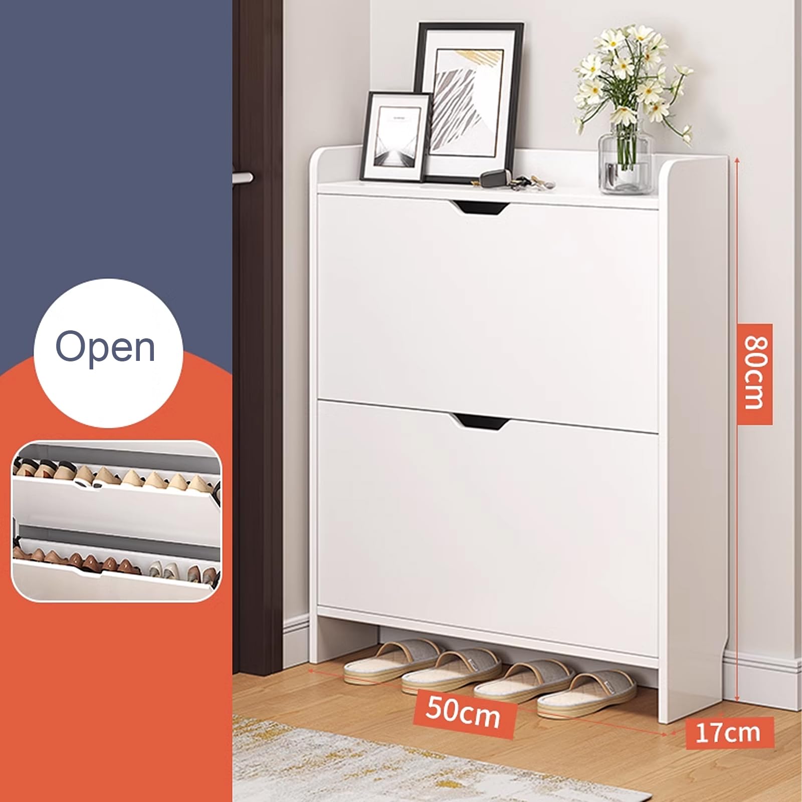 Schluss mit dem Schuh-Chaos im Flur! Dieser super schmale Schuhschrank passt selbst in die engsten Eingangsbereiche. Nur 17 cm tief - stellt ihn einfach hinter die Tür und schon ist Ordnung im Haus. In verschiedenen Größen erhältlich (50, 80 oder 100 cm breit). Das Flip-Down-Design klappt platzsparend nach unten und bietet überraschend viel Stauraum. Mit praktischen Schubladen und Fächern für optimale Organisation. Der untere Bereich ist perfekt für Hausschuhe - einfach reinschlüpfen ohne den Schrank öffnen zu müssen. Aus stabilem Kunststoff in weißer Holzoptik, einfach zusammenzubauen. Die hohlen Griffe sehen nicht nur stylisch aus, sie sind auch super praktisch. Macht jeden Flur sofort aufgeräumter und größer! Perfekt für kleine Wohnungen, Studios oder überall wo Platz knapp ist. Endlich alle Schuhe ordentlich verstaut und griffbereit. Ein echter Raumwunder für alle, die clever organisieren wollen! Einfach aufstellen und sich über mehr Platz freuen.