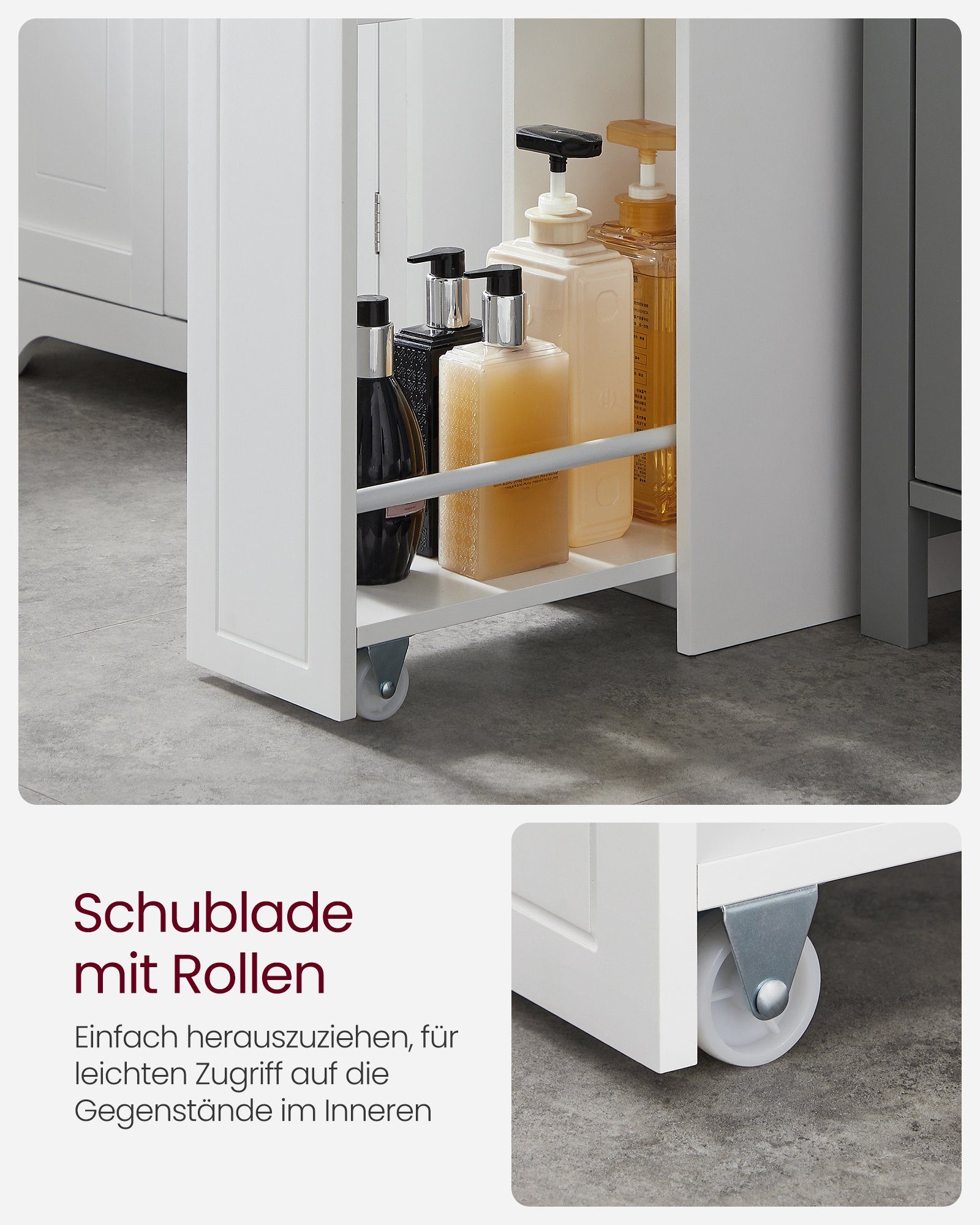 Platzprobleme im Bad? Dieser schmale Schrank ist die Lösung! Mit nur 17 cm Breite findet er selbst in die kleinsten Badezimmer eine Lücke. Die durchscheinbare Schublade gibt den Blick frei auf Kosmetik, Handtücher oder Putzmittel - alles immer griffbereit. Besonders clever: Das integrierte Toilettenpapier-Fach! Die 4 lenkbaren Rollen machen das Reinigen und Umstellen zum Kinderspiel. Komplett montiert geliefert - einfach auspacken und sofort nutzen! Aus robustem, wasserresistentem Kunststoff hält der Schrank auch feuchter Badezimmerluft stand. Perfekt nicht nur fürs Bad, sondern auch für Waschküche, Abstellraum oder sogar unter dem Kühlschrank. Endlich Ordnung in den ganzen Kleinigkeiten! Mach dein Bad aufgeräumt und stylisch ohne komplizierte Montage. Ein echter Game-Changer für kleine Räume!