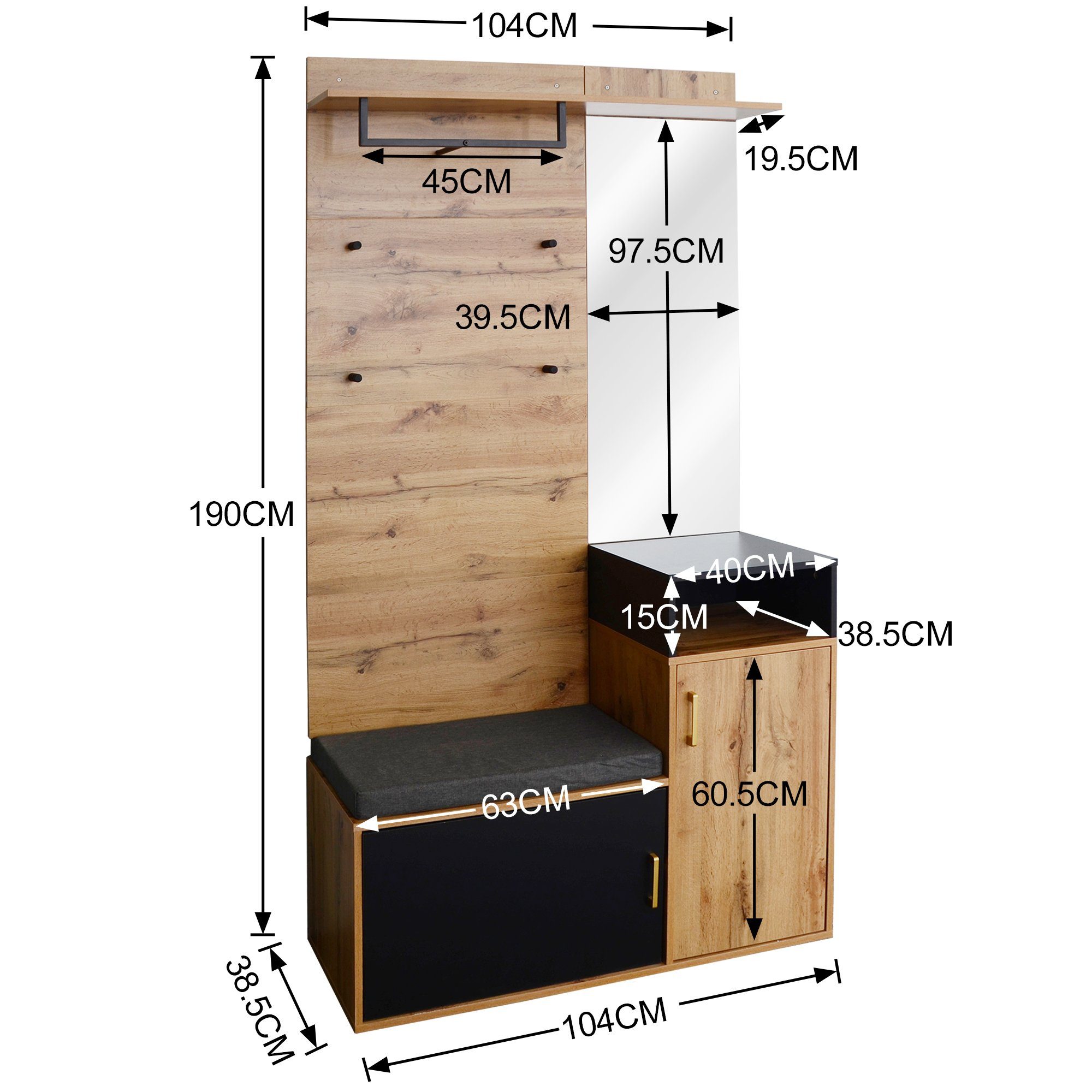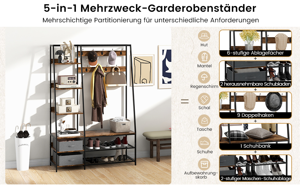 Endlich Ordnung im Flur! Dieser praktische Garderobenständer kombiniert alles, was du brauchst: 8 stabile Doppelhaken für Jacken und Taschen, einen geräumigen Schuhschrank mit höhenverstellbaren Einlegeböden und eine gemütliche Sitzbank zum Schuhe anziehen. Aus robusten Span- und MDF-Platten, die bis zu 120kg aushalten. Die Sitzbank in ergonomischer Höhe macht das Anziehen der Schuhe richtig bequem. Oben bieten zwei offene Fächer Platz für Hüte, Handschuhe oder dekorative Körbe. Der Schuhschrank fasst bis zu 10 Paar Schuhe - ob flache Sneaker oder hohe Stiefel, dank verstellbarer Böden passt alles. Mit Kippschutz für maximale Sicherheit, besonders wenn Kinder im Haus sind. In modernem Weiß passt sich das Set jedem Einrichtungsstil an. Ob im Eingangsbereich, Flur, Schlafzimmer oder sogar im Wohnzimmer - dieses Garderoben-Set sorgt für Ordnung und sieht dabei noch super aus. Platzsparendes Design, das trotzdem unheimlich viel Stauraum bietet. Dein Flur wird nie wieder chaotisch aussehen!