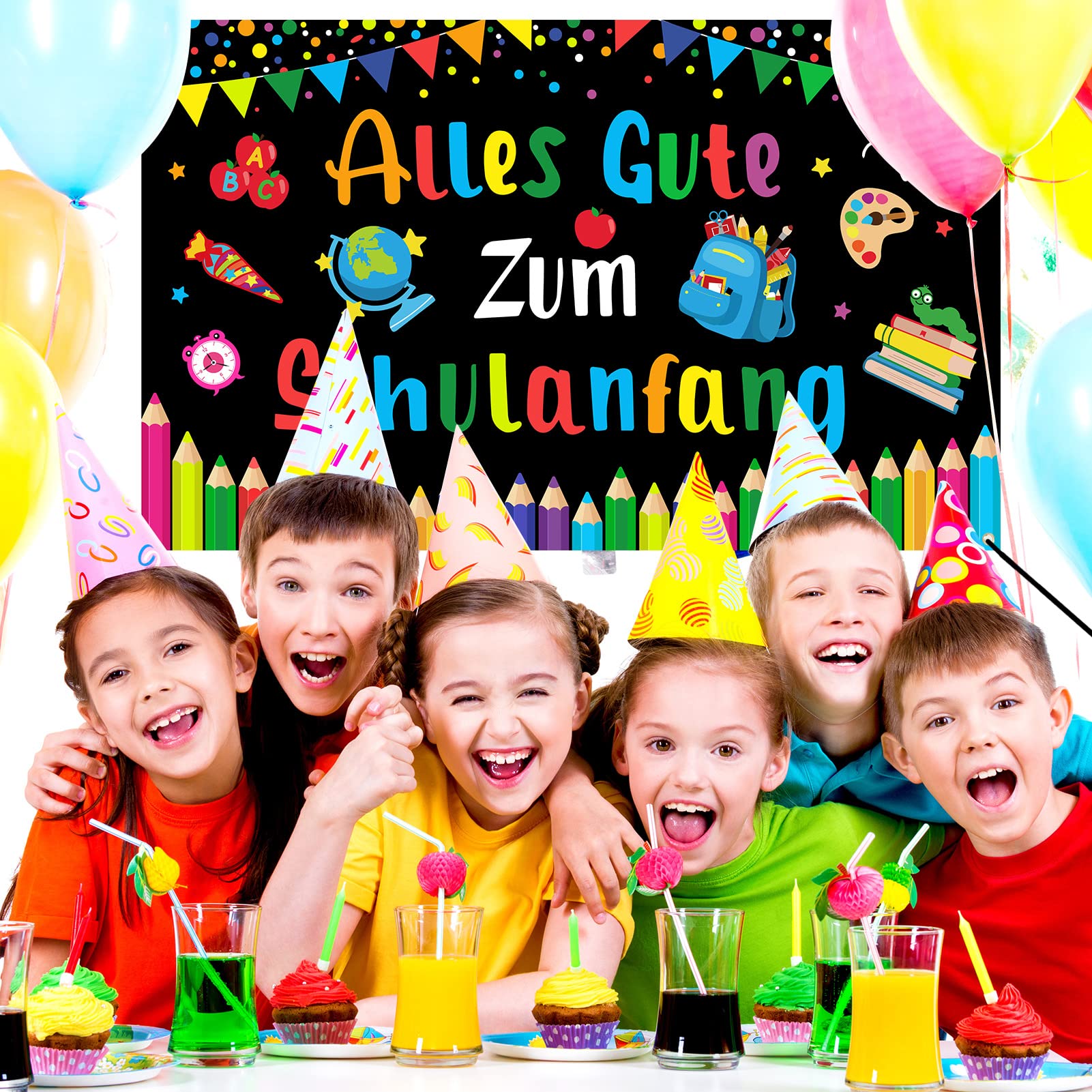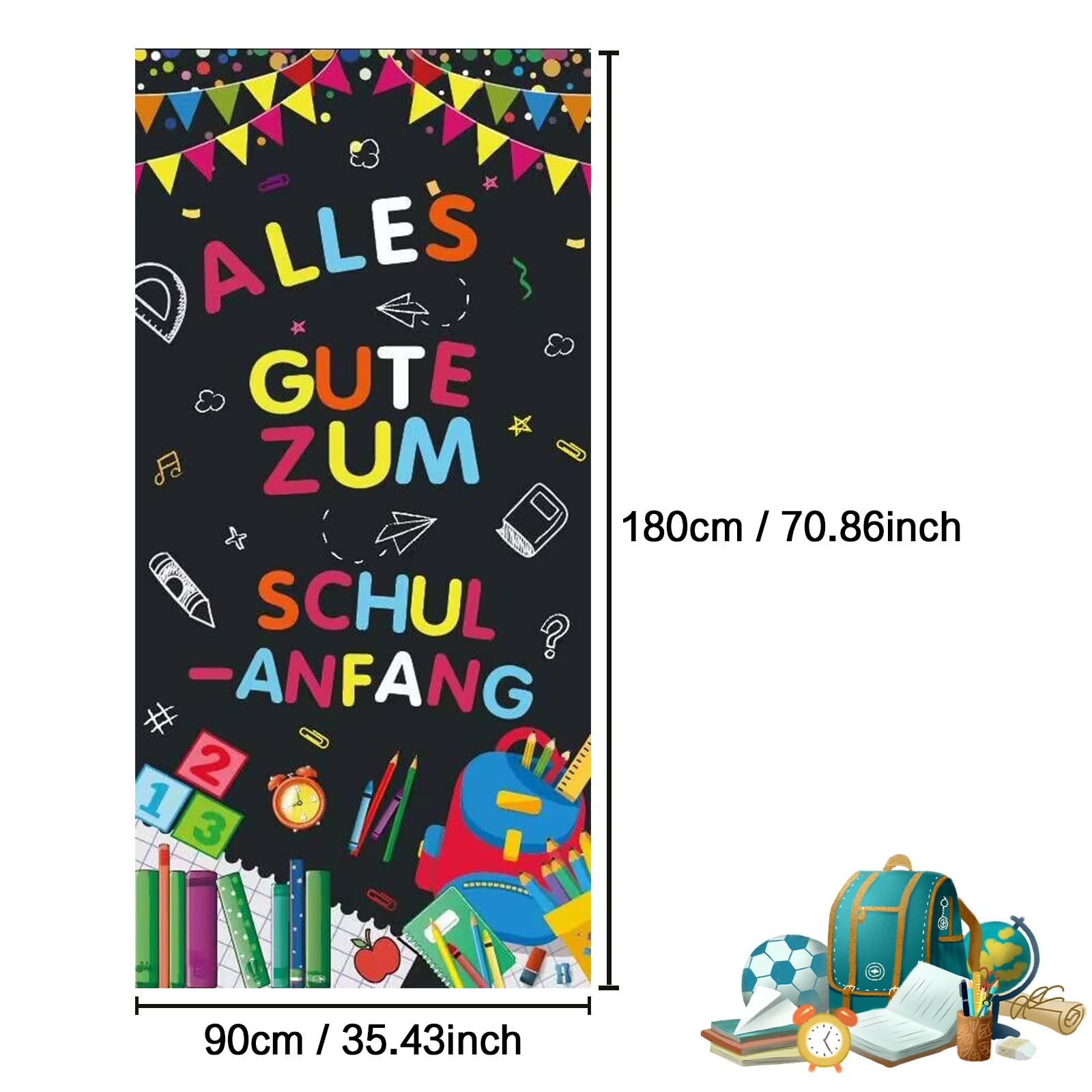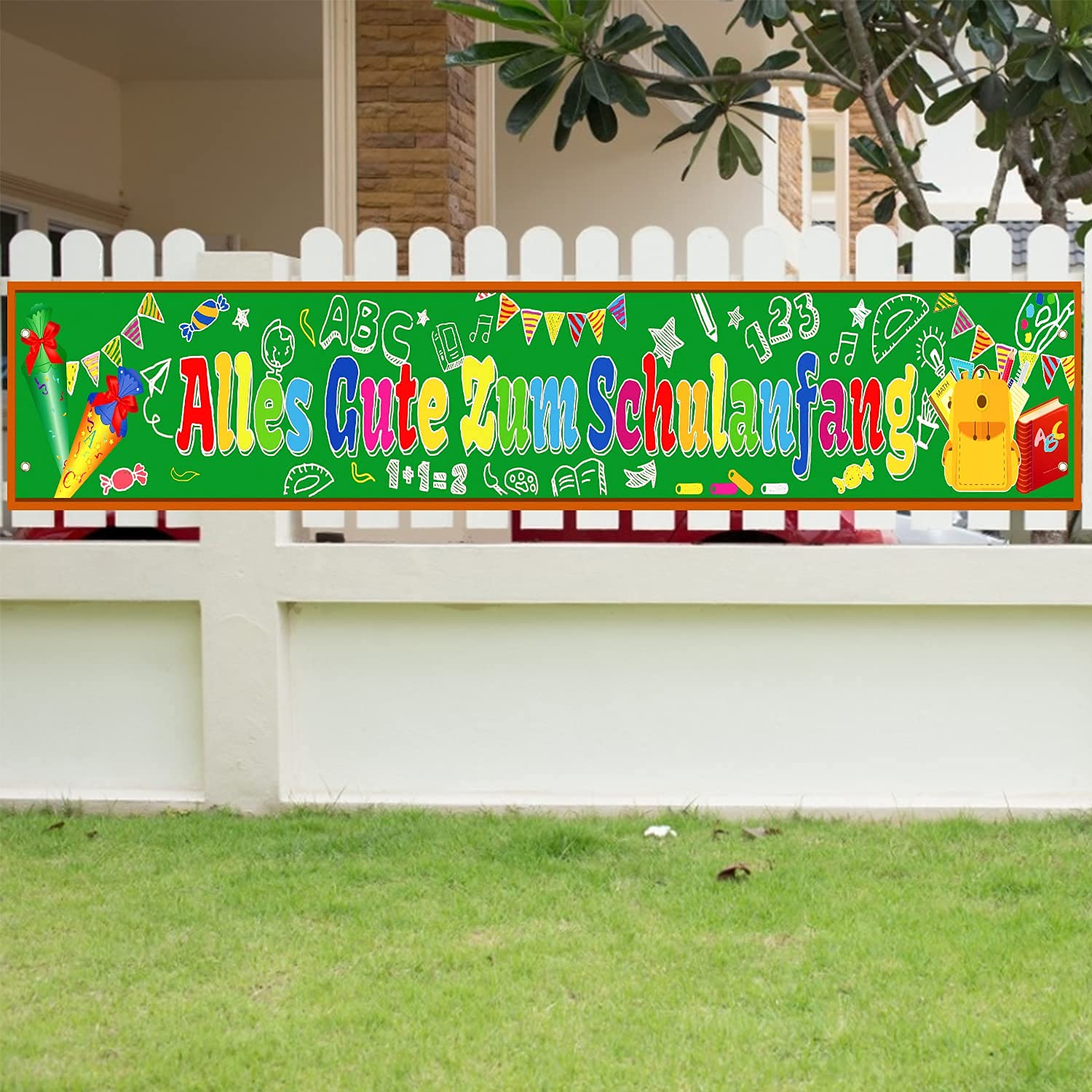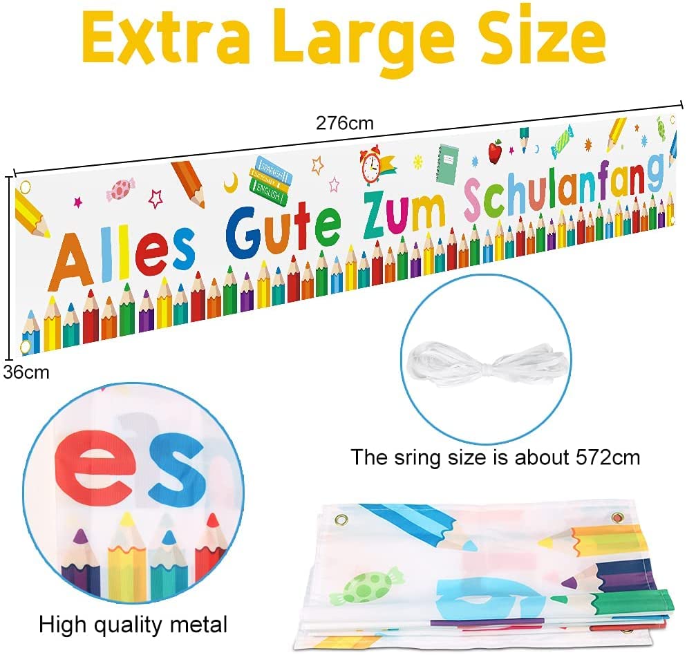 Hurra, der erste Schultag! Dieses riesige Einschulungs-Banner ist perfekt für die große Feier. Maße: 180x110cm - also richtig imposant! Mit süßem 'Alles Gute Zum Schulanfang' Aufdruck und allen wichtigen Schulelementen: Tafel, Zuckertüte, ABC, 123, Stifte, Bücher und mehr. Aus Polyestergewebe, waschbar und wiederverwendbar - also nächstes Jahr wieder einsetzbar. Mit 10m Seil zum einfachen Aufhängen - einfach durch die vier Ösen fädeln und aufhängen. Perfekt für Tür, Wand, Fenster, Tisch oder sogar als Foto-Hintergrund. Ob drinnen oder draußen im Garten - sorgt für fröhliche Schulanfangs-Atmosphäre. Die leuchtenden Farben machen jeden Raum bunter. Ideal als Geschenk für Jungen und Mädchen zum Schulstart. Einfach aufhängen und die Einschulung wird zum unvergesslichen Erlebnis! Für alle stolzen Eltern und Großeltern, die den großen Tag gebührend feiern wollen.