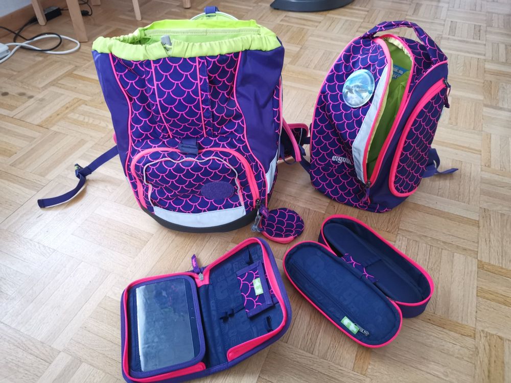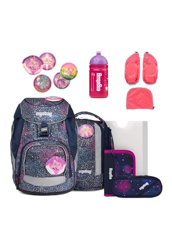 Der perfekte Start in die Schulzeit! Dieses ergobag Set hat alles, was dein Kind für die Schule braucht. Der Rucksack ist super ergonomisch mit höhenverstellbarem Rückensystem, Beckenflossen und Brustgurt - so wird das Gewicht optimal verteilt. Im Set enthalten: Der Hauptrucksack mit auslaufsicherem Fach für die Trinkflasche, stabiler Bodenwanne und praktischen Seitentaschen. Dazu kommt ein Sportbeutel, der einfach am Rucksack befestigt werden kann - Hände frei! Hochwertige Reflektoren sorgen für Sicherheit im Dunkeln. Das Design 'Bärlaxy' in Lila ist einfach niedlich. ergobag steht für Qualität und Verantwortung - PFC-frei und fair produziert. Ein toller Begleiter für die gesamte Grundschulzeit. Dein Kind wird den Rucksack lieben und hat alles perfekt organisiert!