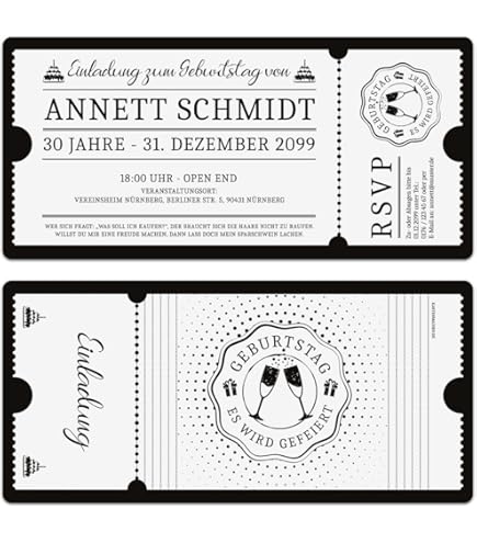 Suchst du nach coolen Einladungskarten für deine nächste Geburtstagsparty? Diese Schwarz-Weiß Ticket Einladungen sind total im Trend und machen richtig was her! Das Format ist DIN Lang quer (210 x 98 mm) und gedruckt auf hochwertigem 300g/qm Papier - fühlt sich richtig wertig an. Besonders praktisch: Die Karten haben eine Perforation zum Abtrennen, so kannst du den Teil mit den wichtigsten Infos einfach abtrennen und als Erinnerung behalten. Die abgerundeten Ecken geben den Karten einen extra stylischen Look. Du kannst deine eigenen Texte individuell bedrucken lassen - so wird jede Einladung ganz persönlich. Die Lieferung erfolgt innerhalb von 1-2 Tagen, also perfekt auch für spontane Feiern. Tipp: Passende Briefumschläge in DIN Lang (220 x 110 mm) gibt's bei uns im Shop separat dazu. Egal ob für eine coole Jugendparty, einen runden Geburtstag oder einfach nur eine gemütliche Runde mit Freunden - mit diesen Karten machst du definitiv Eindruck! Das Schwarz-Weiß Design ist zeitlos und passt zu jedem Motto. Einfach klasse für alle, die es modern und unkompliziert mögen.