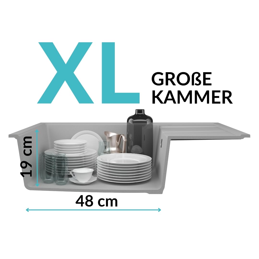 Diese Granitspüle von GRANMASTER ist einfach der Hammer für deine Küche! Mit den Maßen 78x50x20,3 cm passt sie super in kleinere Küchen und macht trotzdem was her. Aus 80% Quarz und 20% Spezialharz ist sie richtig robust - kratzfest, temperaturbeständig und schlägt so schnell nichts kaputt. Die schwarze Farbe in Metallic-Optik verblasst nicht und ist super pflegeleicht. Praktisch: Sie kommt komplett mit Siphon, Montageschablone und Anleitung. Aber Achtung: Für den Wasserhahn musst du selbst Löcher bohren, die sind nicht vorgefertigt. Perfekt für Unterschränke ab 60 cm Breite. Mit 14,5 kg hat sie ein gutes Gewicht und liegt stabil. Die integrierte Abtropffläche ist super praktisch fürs Geschirr. So eine Spüle macht richtig was her und hält ewig - da freut sich jeder Hobbykoch!