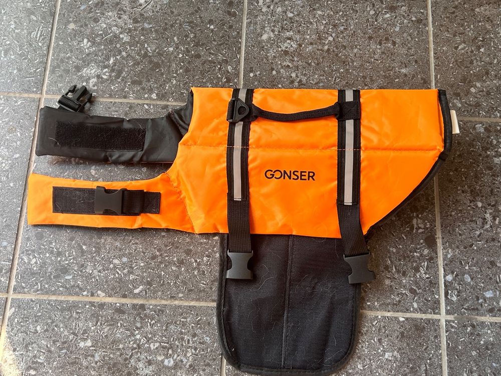Super praktisch: Verstellbare Klettverschlüsse an Hals und Bauch sorgen für perfekten Sitz. Und der stabile Griff auf dem Rücken ist ein echter Game-Changer! Im Notfall kannst du deinen Hund damit schnell und sicher aus dem Wasser heben.