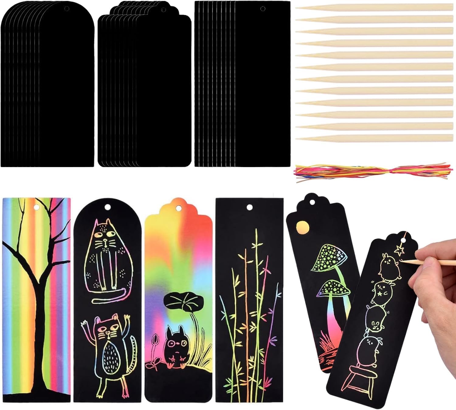 Malen mit dem Zauberstab? Mit diesen Kratzbildern wird's möglich! Einfach die schwarze Oberfläche abkratzen und schon erscheinen bunte Regenbogenfarben! Dein Kind wird staunen! 🌈\\n\\nIm Set: 120 Kratzbilder + 12 Holz-Kratzstifte - genug für viele kreative Stunden! Jedes Bild misst 8,5x8,5cm - perfekt für kleine Hände. Ohne Farbrückstände oder Staub - sauber und unkompliziert.\\n\\nFördert Konzentration und Feinmotorik spielerisch! Ideal für Zuhause, Kindergarten oder Geburtstagsfeiern. Unter Aufsicht verwenden! Die fertigen Kunstwerke kannst du aufhängen oder verschenken - Stolz garantiert!