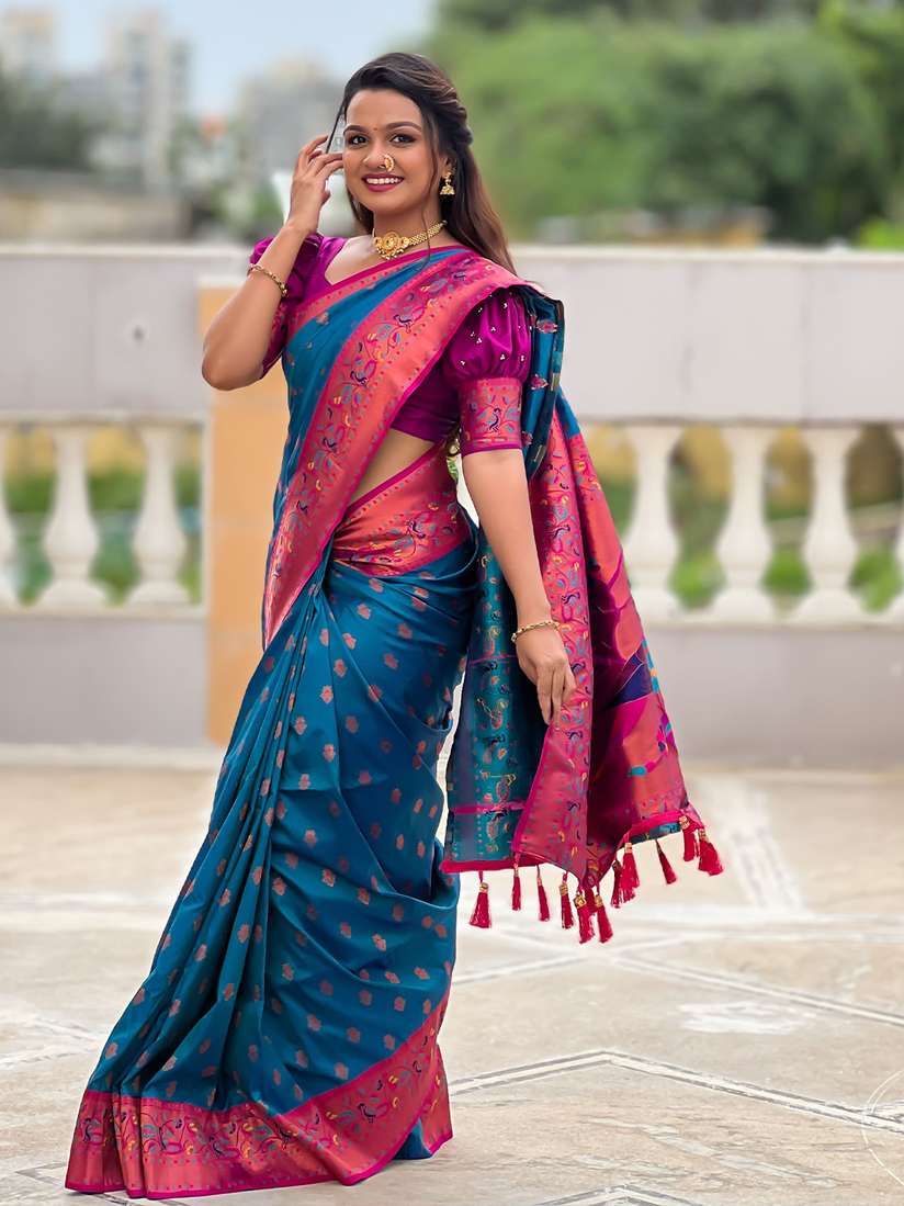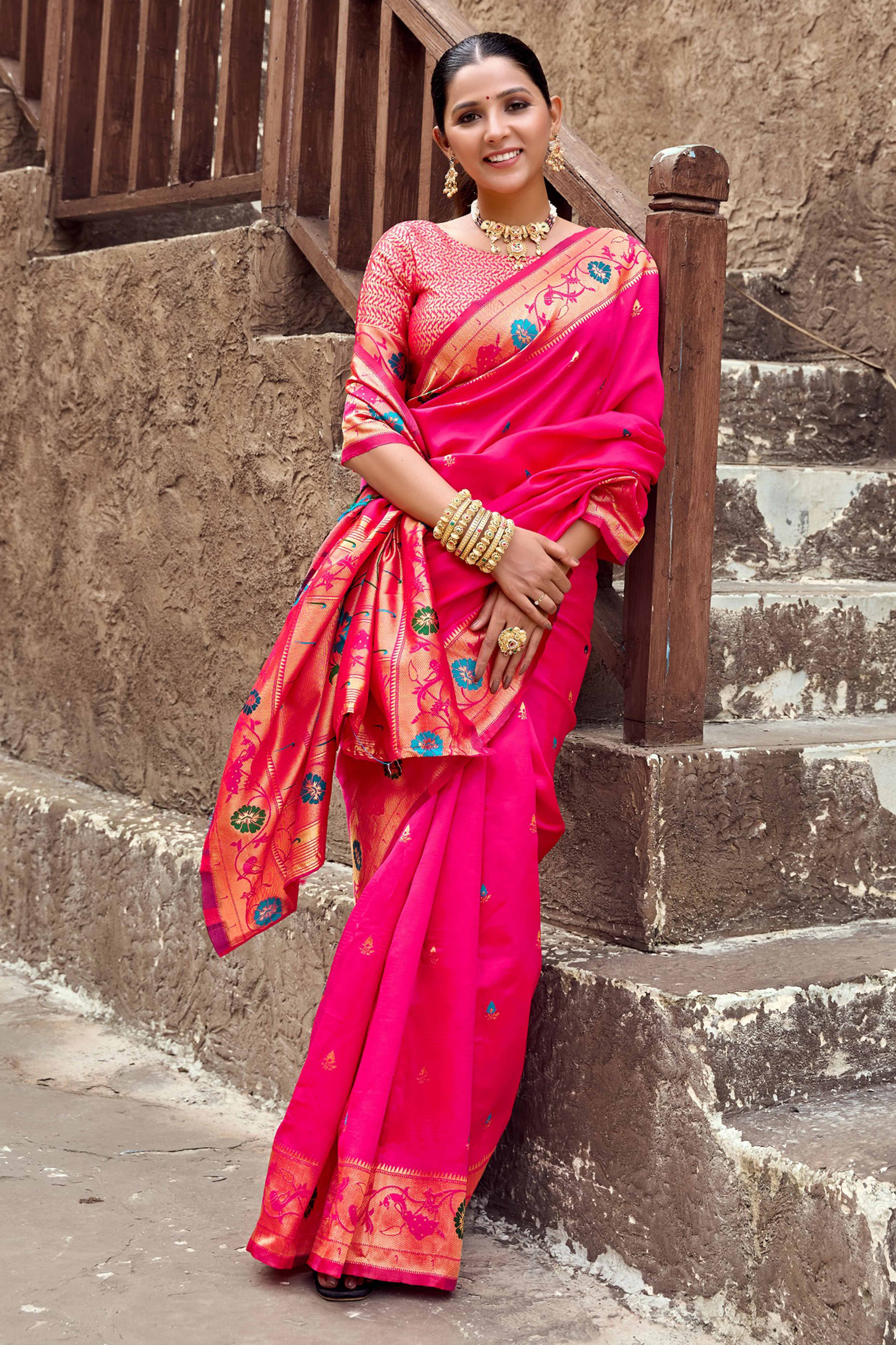 Ein Traum in Seide! Dieser wunderschöne Paithani Saree in Rosa bezaubert mit opulenter goldener Zari-Stickerei und kunstvollen Pfauenmotiven. Aus reiner Seide gefertigt - 5,5m lang und 1,1m breit. Im Set inklusive Blusenteil (0,8m) für den perfekten Look. Die Pfauendesigns symbolisieren Schönheit und Anmut - perfekt für Hochzeiten, Feste und besondere Anlässe. Muss chemisch gereinigt werden, damit die Pracht erhalten bleibt. Ein echtes Kunstwerk, das traditionelles Handwerk mit modernem Stil verbindet. Werde zur Königin bei jedem Event!