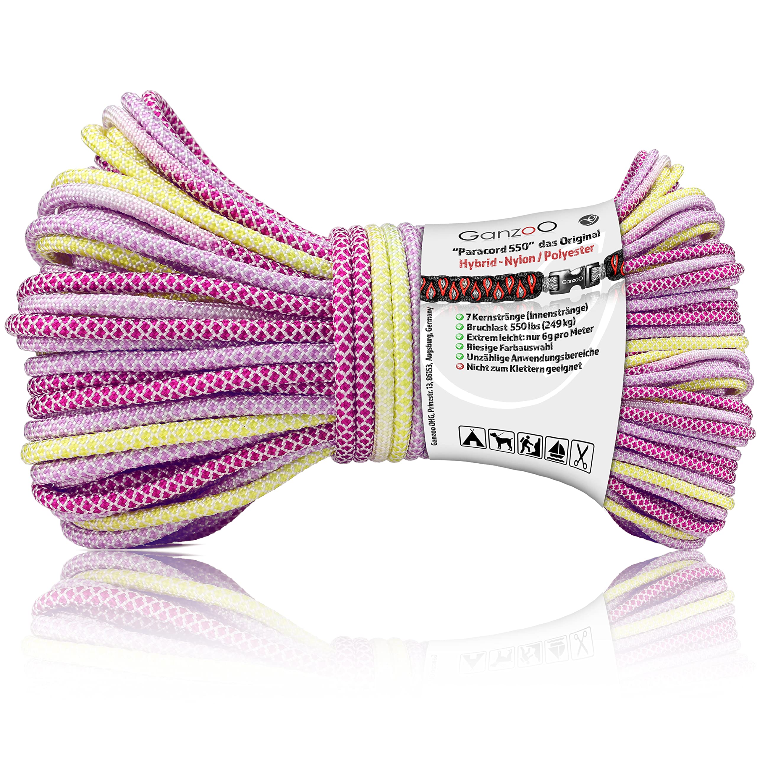 Perfekt für Hundeleinen, Armband knüpfen, Zelt-Abspannungen oder Notfall-Ausrüstung. In gelb-violett gut sichtbar im Gelände. Einfach zu schneiden und zu verarbeiten.