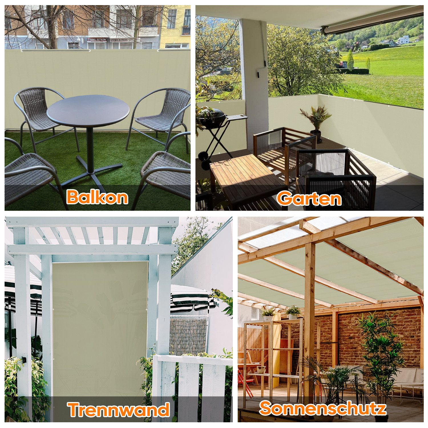 Maße: 90x300 cm - lässt sich bei Bedarf zuschneiden. UV-beständig, reißfest und schimmelresistent. Auch für Terrasse, Pool oder Garten geeignet. Farbe: Taupe - dezent und modern. Einfach aufhängen und entspannt den Balkon genießen!