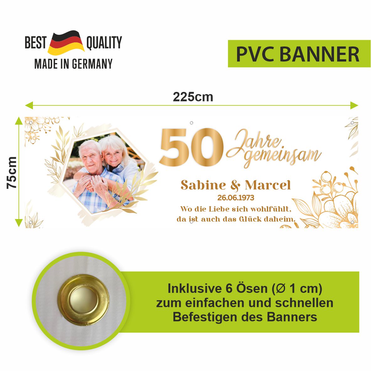 Hey, stell dir vor: Dein eigenes Banner mit deinem Foto, Logo oder Text! Dieses personalisierte Banner kannst du komplett selbst gestalten - einfach auf 'Jetzt anpassen' klicken und loslegen! Du wählst aus 5 Größen: von 30x120 cm bis 120x180 cm - für jeden Zweck das Richtige. Das Material ist 100% Polyester, waschbar und UV-beständig - die Farben verblassen also nicht so schnell. An den vier Ecken sind Metallösen, damit du das Banner überall aufhängen kannst. Perfekt für Geburtstagsfeiern, Hochzeiten, Firmenevents oder Stadtfeste. Dein Design wird einseitig gedruckt, und damit es richtig scharf wird, lade am besten ein hochauflösendes Bild hoch. Ob als Willkommensgruß, Glückwunschbanner oder Werbung - damit fällst du auf! Einfach in der Maschine waschen (nicht bleichen) und bei niedriger Temperatur bügeln. So macht Feiern richtig Spaß - mit deinem persönlichen Banner!