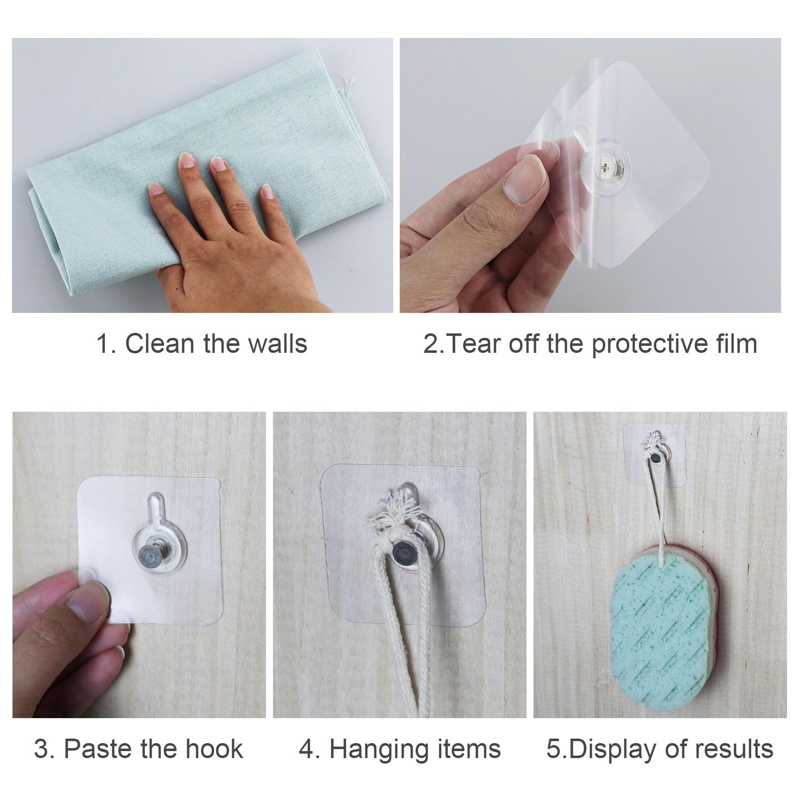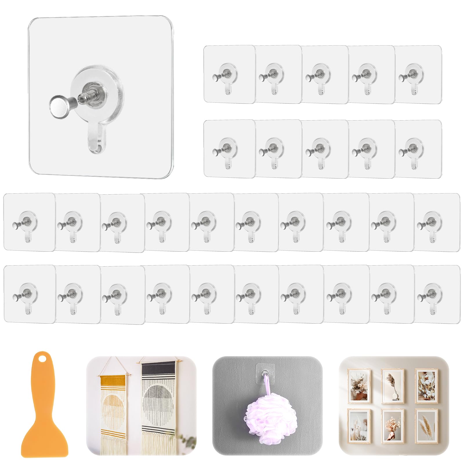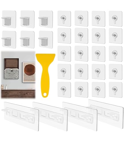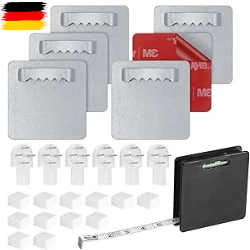 Bilder aufhängen ohne Bohrmaschinen-Lärm? Ja, geht! Mit diesen 30 transparenten Bilderhaken klebst du deine Fotos, Poster oder leichte Bilder einfach an die Wand. Halten bis 5 kg - also alles, was nicht super schwer ist. Aus stabilem PC-Material mit Edelstahl, wasser- und feuchtigkeitsbeständig. Einfach die Schutzfolie abziehen, festdrücken und 24 Stunden warten - dann hält's! Mit dem beiliegenden Schaber kriegst du alle Luftblasen raus. Perfekt für glatte Oberflächen wie Fliesen, Metall oder lackiertes Holz. Aber Achtung: Nicht für Tapeten oder raue Wände! Wenn du die Haken wieder abmachen willst: Mit Fön erwärmen und vorsichtig abziehen. Für Wohnzimmer, Bad, Küche - überall wo du was dekorieren willst. 60x60mm groß, kaum sichtbar. 30 Stück + 1 Schaber - da hast du lange was von!