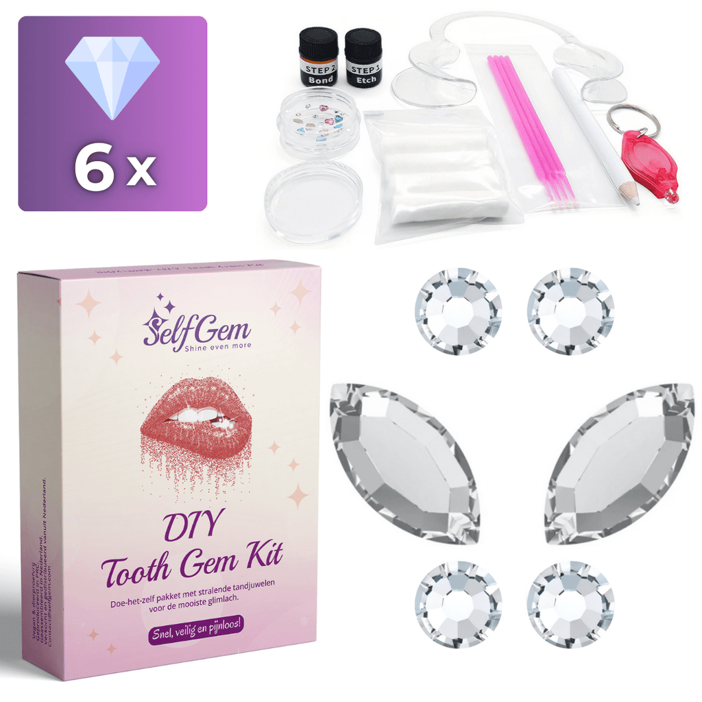 Glitzer für Dein Lächeln! Mit diesem SelfGem Set bringst Du ganz easy Zahnschmuck an - ohne Zahnarzttermin. Alles dabei, was Du brauchst: 6 funkelnde Zahnsteine und das nötige Zubehör. Einfache Schritt-für-Schritt-Anleitung macht's auch für Anfänger einfach. Die Steine sind sicher für den Zahnschmelz und halten gut. Perfekt für Partys, Festivals oder einfach um Dein Lächeln aufzupeppen. Ob dezenter Glitzer oder auffälliger Stein - gestalte Dein persönliches Lächeln. Wichtig: Vorher Anleitung genau durchlesen für beste Ergebnisse!