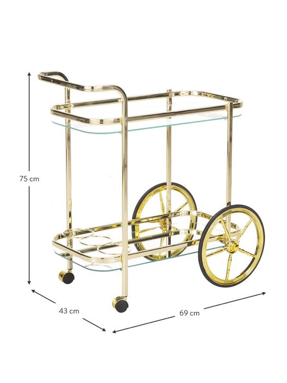 Wow, was für ein stylischer Servierwagen! In edlem Gold mit spiegelnden Glasplatten - der bringt richtig Luxus-Feeling in dein Wohnzimmer. Maße: 64x50x33 cm (H/B/T).