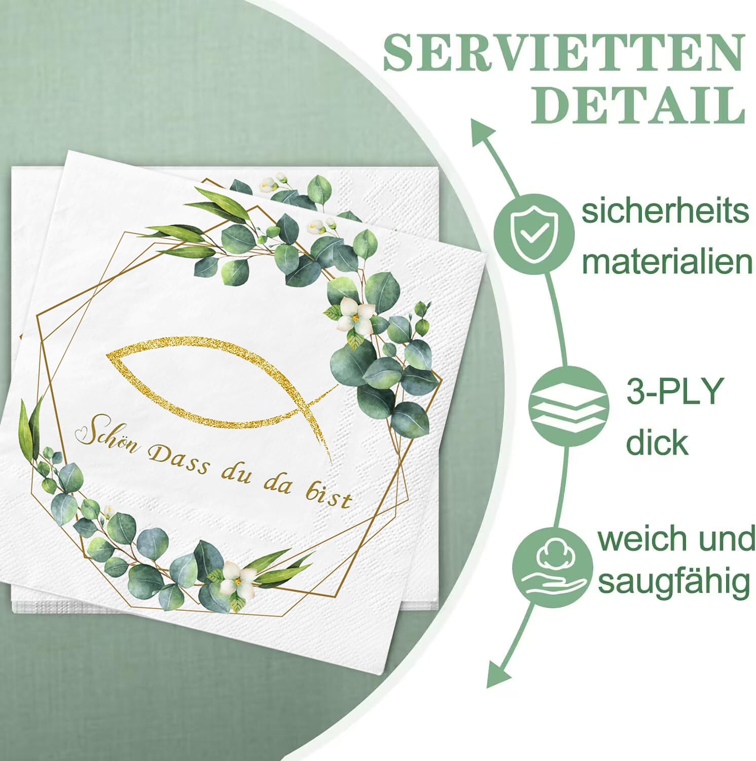 Diese wunderschönen Servietten machen jede Tauf- oder Kommunionsfeier zu etwas Besonderem! Das Motiv zeigt zarte Eukalyptus-Zweige mit Fischen - ein Symbol für Leben und Segen. Mit dem Aufdruck 'Schön dass du da bist' bedankst du dich bei deinen Gästen. Das 60er-Pack reicht für eine ganze Feier. Aus hochwertigem, saugstarkem Papier das nicht durchdrückt. Maße: 33x33cm ungefaltet, 16,5x16,5cm gefaltet. Das elegante Design in Weiß mit grünen Akzenten passt zu jeder Tischdekoration. Auch super für Konfirmation, Geburtstage oder Jubiläen. Einfach auf den Tisch legen und schon wirkt die Feier gleich viel festlicher. Praktisch, schön und mit einer tollen Botschaft - was will man mehr?