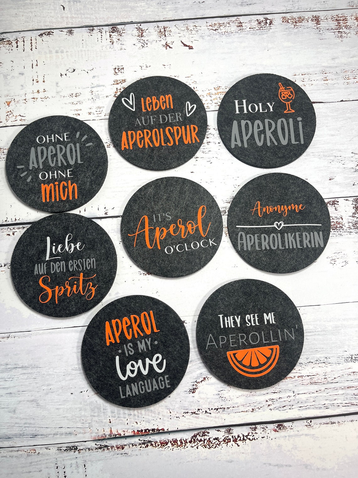Prost mit Stil! Dieses Aperol Spritz Set bringt italienisches Flair an deinen Tisch. Enthalten sind 10 verschiedene Filzuntersetzer mit lustigen Aperol-Sprüchen und 5 Glasstrohhalme mit gravierten Zitaten. Die Untersetzer haben 10 cm Durchmesser und sind 5 mm dick - perfekt für alle Standardgläser! Aus hochwertigem Filz schützen sie deine Tische vor lästigen Wasserflecken und Hitze. Die Glasstrohhalme sind 20 cm lang und passen in fast jedes Glas! Das orangefarbene Aperol-Zitat ist per Laser eingraviert - das verblasst nie! Super praktisch: Alles ist spülmaschinenfest und wiederverwendbar! Perfect für deine nächste Gartenparty, Sommerfest oder gemütlichen Abend mit Freunden. Auch ein tolles Geschenk für Aperol-Liebhaber! Die verschiedenen Designs sorgen für Abwechslung und gute Laune. Einfach dekorieren, Getränke servieren und den Sommer genießen! Mach deine Party zum unvergesslichen Event mit diesem stylischen Aperol-Set. Bella Italia auf deinem Tisch!