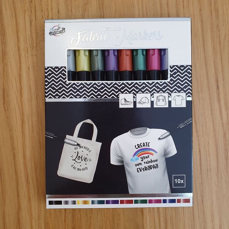 Total coole Textilstifte für alle Kreativen! Mit den 10 Magic-Stiften kannst du deine eigenen T-Shirts designen - ob Namen, Muster oder coole Sprüche. Einfach draufmalen, mit dem Bügeleisen fixieren (nicht zu heiß!) und schon hält's auch nach dem Waschen bei 60 Grad. Achtung: Nicht für Kinder unter 3 Jahren wegen Verschluckgefahr! Made in EU - also gute Qualität. Perfekt für Geburtstage, Kinderpartys oder einfach mal was Anderes am Wochenende. Der Fantasie sind keine Grenzen gesetzt - mal loslegen!