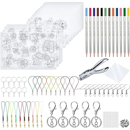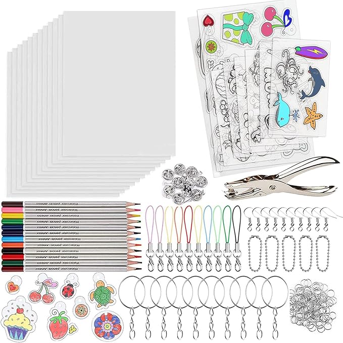Mega Bastelspaß für Groß und Klein! Dieses Schrumpffolie-Set von Pmueuff hat alles was das Herz begehrt: 15 Schrumpffolien, 145 Schlüsselanhänger-Teile, Locher und 12 Buntstifte. Einfach Muster auf die raue Seite malen, ausschneiden, Löcher stanzen und ab in den Backofen bei 165°C für 2-3 Minuten. Oder mit nem Fön flachdrücken - aber Vorsicht vor Verbrennungen! Kinder nur unter Aufsicht von Erwachsenen arbeiten lassen. Damit könnt ihr Schlüsselanhänger, Ohrringe, Lesezeichen, Broschen und vieles mehr basteln. Perfekt für Kindergeburtstage, Bastelkurse oder Eltern-Kind-Nachmittage. Der Kreativität sind keine Grenzen gesetzt! Einfach ausprobieren und tolle 3D-Objekte zaubern!