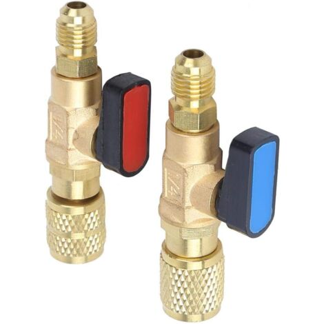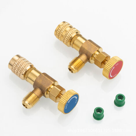 Professionelle Kältetechnik für deine Klimaanlage! Dieses 2-teilige Adapter-Set besteht aus einem roten Hochdruck- und einem blauen Niederdruck-Adapter für Standard 1/4\ SAE Füllschläuche. Aus Messing und ABS gefertigt, ist es besonders verschleißfest und alterungsbeständig. Kompatibel mit den Kältemitteln R22 und R410A. Die Installation ist denkbar einfach - nur eine Vierteldrehung des Ventilgriffs genügt, um das Kältemittel zu steuer. Reduziert Kältemittelverluste und passt zu jedem Standard-SAEO Kältemittelschlauch. Ideal für HVAC-Techniker, Kälteanlagenbauer oder versierte Heimwerker. Mit den Maßen 3,1x7,3x1,4cm und einem Gewicht von 172g sind die Adapter handlich und praktisch. Ein unverzichtbares Zubehör für die Wartung und Befüllung von Klimaanlagen - ob im privaten oder gewerblichen Bereich!
