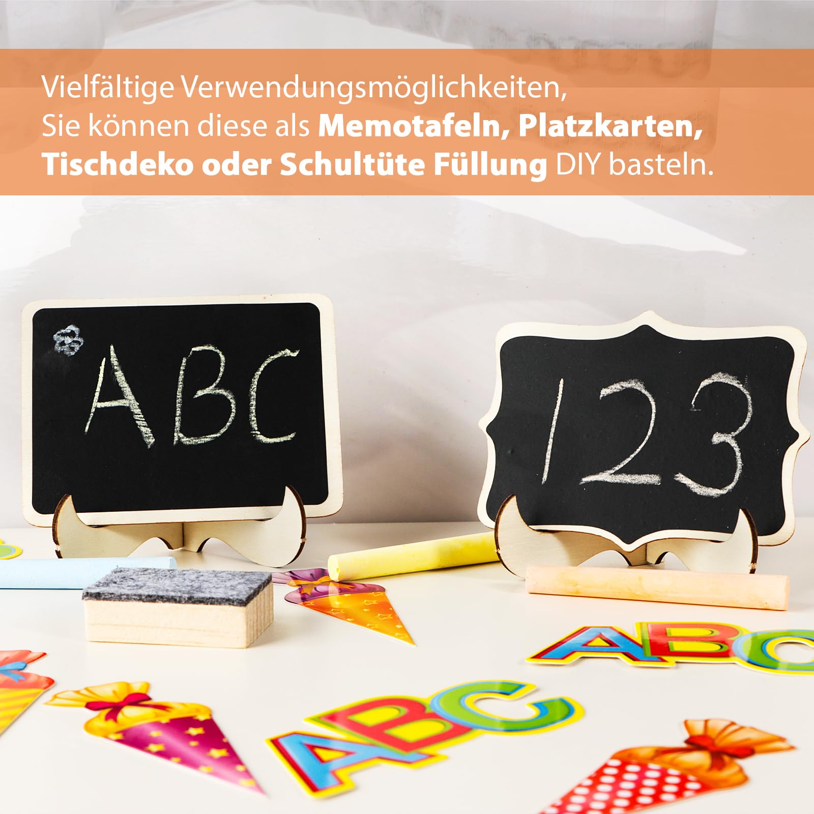 Hurra, der erste Schultag steht bevor! Mit diesem süßen Deko-Set machst du die Einschulung zu einem unvergesslichen Erlebnis. Im Set enthalten sind 36 bunte Streudeko-Teile mit Motiven von Schultüten, ABC-Buchstaben und Zahlen - perfekt zum Dekorieren des Festtisches oder zum Befüllen von Schultüten. Dazu gibt es 16 niedliche Mini-Tafeln aus Holz, each 10x7,5cm groß, die du mit Kreide beschriften kannst. Die Tafeln sind super vielfältig einsetzbar: als Tischkarten mit den Namen der Gäste, als Platzkarten oder einfach als Deko-Element. Du kannst darauf Willkommensgrüße schreiben oder die Sitzordnung festlegen. Die Papier-Konfetti sind in verschiedenen Designs und Farben gehalten und bringen sofort fröhliche Schulatmosphäre in dein Zuhause. Alles zusammen ergibt eine wunderbare Grundlage für eine gelungene Einschulungsparty. Ob für zu Hause, in der Schule oder im Kindergarten - diese Deko bringt alle in Schulanfangs-Stimmung! Einfach auf dem Tisch verteilen, die Tafeln beschriften und sich über die strahlenden Kinderaugen freuen. Auch als kleines Geschenk für die Schulanfänger super geeignet - damit der große Tag noch schöner wird!