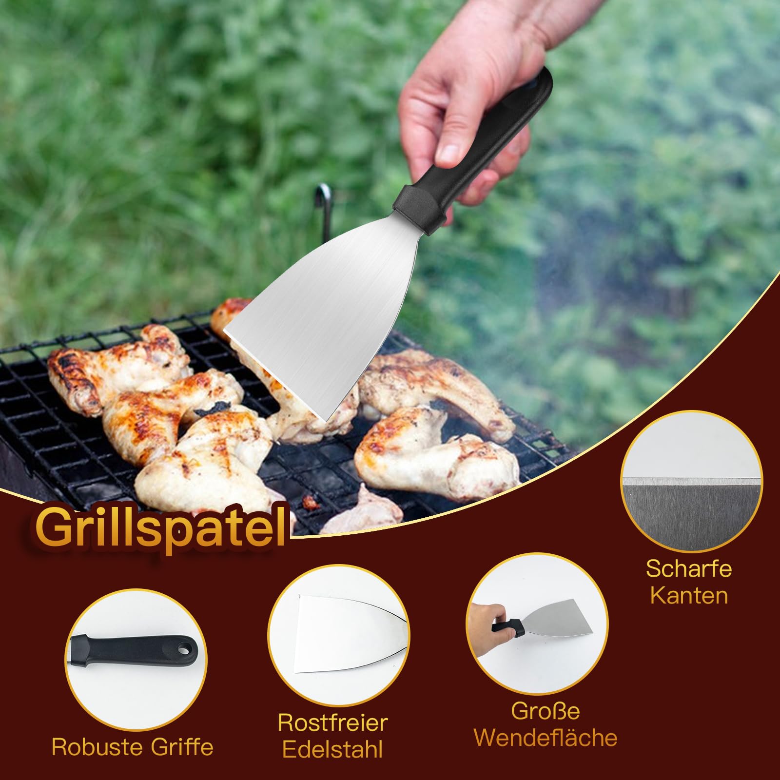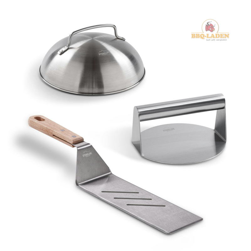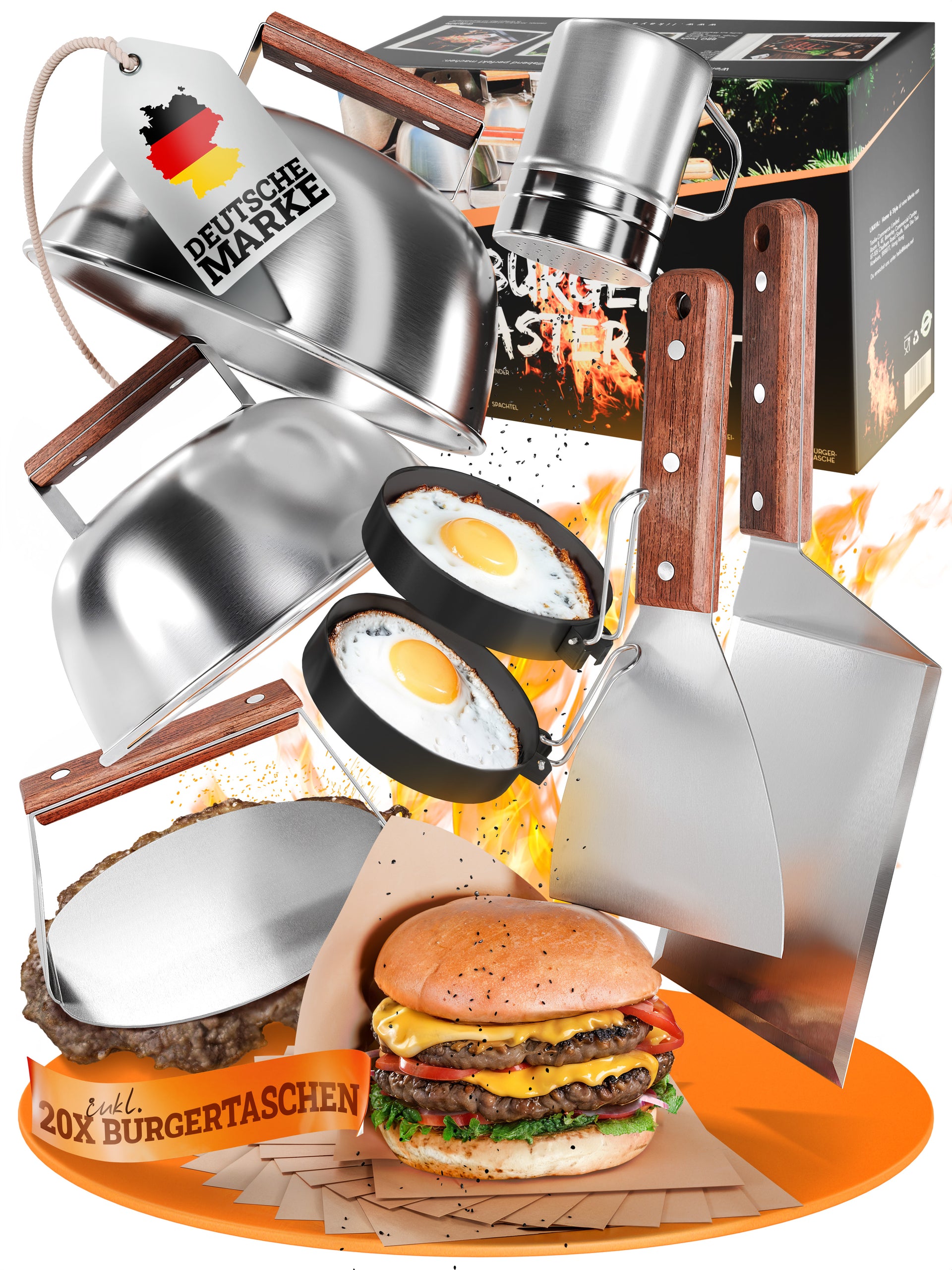 Hol dir den Foodtruck-Geschmack nach Hause! Mit diesem 5-teiligen Burger Smasher Set wirst du zum Grill-Profi. Die massive Edelstahl-Presse macht knusprige, dünne Patties wie beim Profi. Die zwei Burger-Glocken sorgen dafür, dass der Käse perfekt schmilzt und herrlich zerläuft. Der extra-dicke Grillwender (1,5 mm!) verbiegt sich nicht, auch nicht bei schweren Burgern. Die hitzeresistenten Ledergriffe an Spachtel und Wender schützen deine Hände - kein Verbrennen mehr! Alles ist EU-zertifiziert und in Deutschland entwickelt. Ob für den Gasgrill, die Plancha oder die Pfanne - dieses Set macht jeden Burger zum Erlebnis. Perfekt als Geschenk für Grill-Fans oder um dein eigenes Grillgame auf das nächste Level zu bringen. Einfach reinigen, da Edelstahl - und schon kann die nächste Burger-Party kommen!