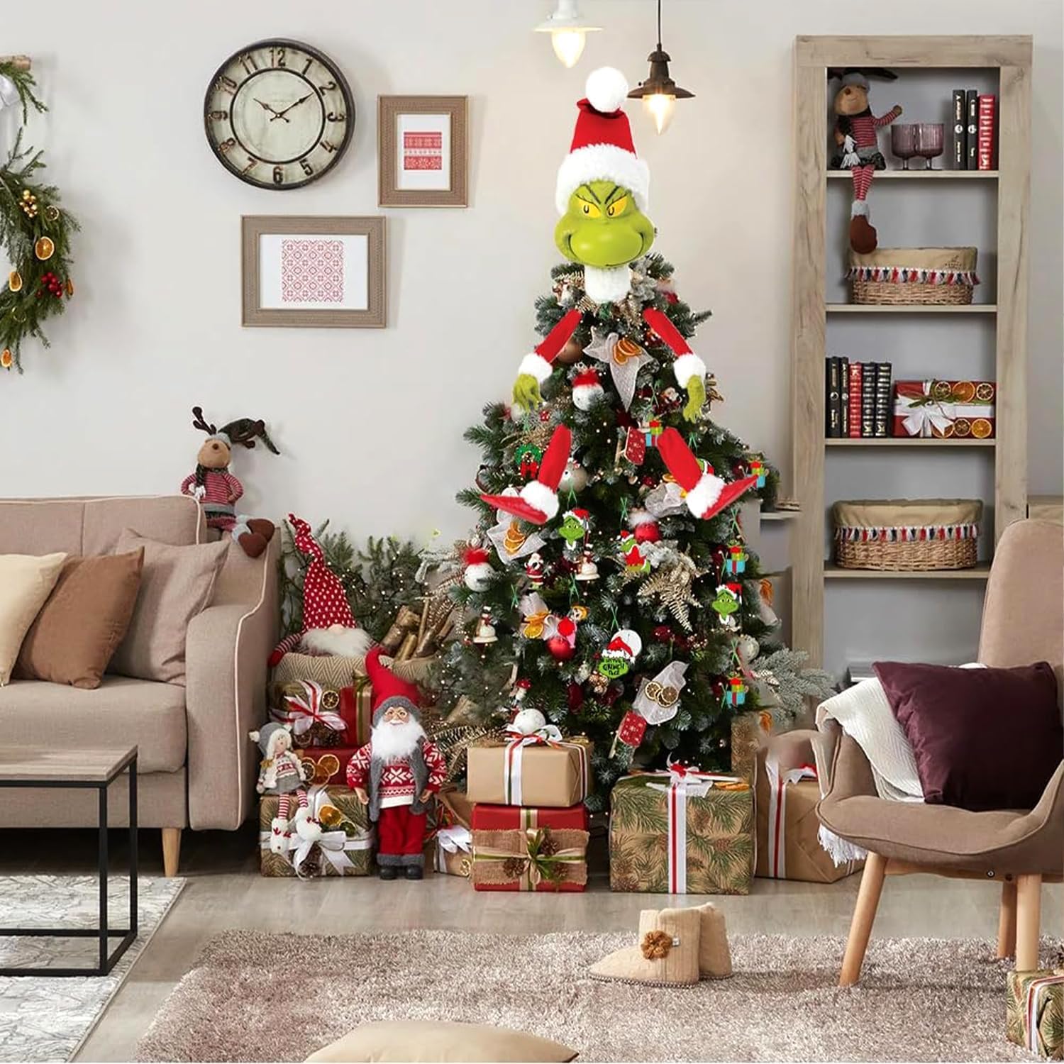 Der Grinch erobert deinen Weihnachtsbaum! 🎄 Dieses 5-teilige Set bringt den beliebten Weihnachtsmuffel in dein Zuhause. Enthält: Kopf (13,2x15,7 Zoll), Arme, Beine und Geschenkbox. Aus robustem PVC, wetterfest für innen und außen. Mit Bambusstäbchen und Acrylkleber für einfache Montage. In klassischen Grinch-Farben Rot und Grün. Perfekt für Weihnachtsbäume, Türen, Fenster oder Partys. Schafft eine lustige, festliche Atmosphäre. Ein tolles Geschenk für Grinch-Fans und alle die Weihnachten etwas anders feiern wollen. Achtung: Enthält kleine Teile, nicht für Kinder unter 3 Jahren!