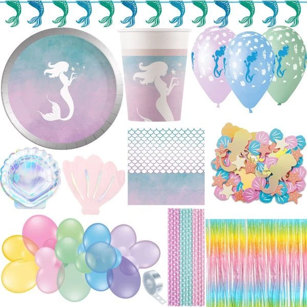 Tauch ein in die magische Welt der Meerjungfrauen! Dieses komplett Party-Set macht jede Geburtstagsfeier unvergesslich. Enthalten sind: 1 Happy Birthday-Banner, 1 Tortenaufleger, 12 Cupcake-Aufleger, 16 bunte Latexballons, 1 Meerjungfrauen-Balloon, 1 spezieller Meerjungfrauen-Luftballon, 6 Sterne-Ballons und 2 Muschel-Schwanz-Balloons. Alles in super Qualität - die Banner und Kuchen-Deko sind aus festem Karton mit knalligen Farben, die Ballons aus robustem Latex. Mega einfach aufzubauen, in wenigen Minuten ist deine Party location verwandelt! Perfekt nicht nur für Geburtstage, sondern auch für Babypartys, Weihnachtsfeiern oder einfach als hübsche Zimmerdekoration. Deine kleine Prinzessin wird Augen machen!