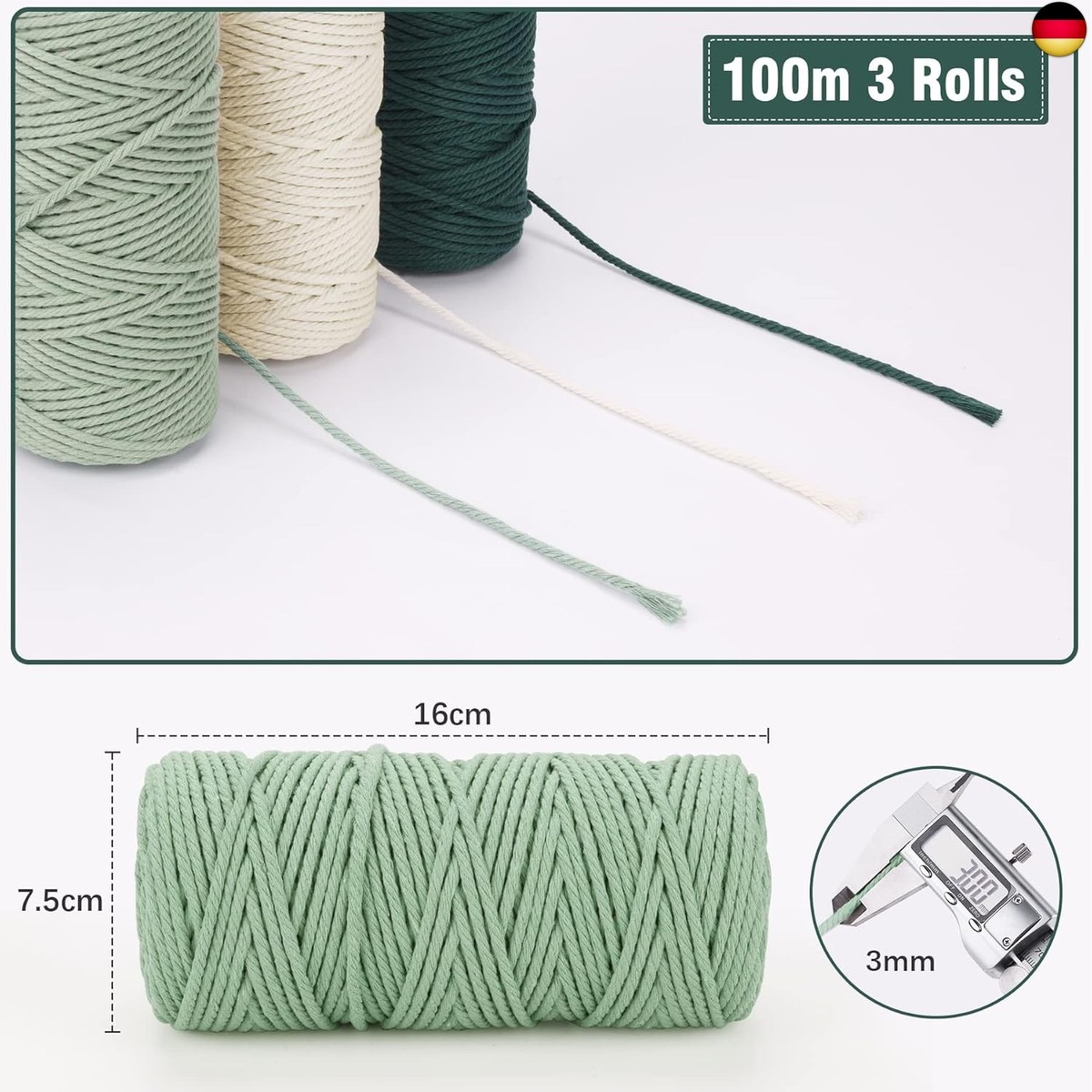 Hey Bastelfreunde! Dieses LEDENT Makramee Garn ist perfekt für alle kreativen Projekte. Im Set bekommst du drei 70 Meter Rollen in den Farben Ecru, Dunkelbraun und Braun - also insgesamt 210 Meter Bastelspaß! Die Stärke von 2mm ist ideal für feinere Arbeiten. Das Besondere: Es ist aus 100% recycelter Baumwolle hergestellt - also nachhaltig und umweltfreundlich. Doppelt gedreht und super reißfest, dabei aber weich und geschmeidig in der Verarbeitung. Hergestellt in Belgien mit viel Handwerkskunst - da kannst du dich auf Qualität verlassen. Egal ob Wandbehänge, Pflanzenampeln, Schlüsselanhänger oder Tischläufer - deiner Kreativität sind keine Grenzen gesetzt! Das Garn fusselt nicht und franst nicht aus - perfect also für anspruchsvolle Projekte. Einfach auspacken und losknüpfen! Ob Anfänger oder Profi - mit diesem Garn machst du garantiert schöne Dinge. Viel Spaß beim Basteln und Kreieren!
