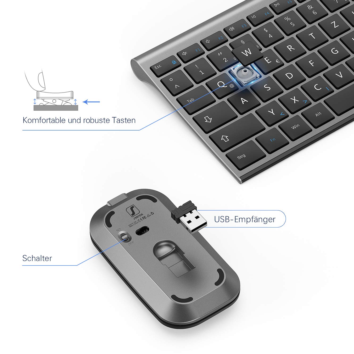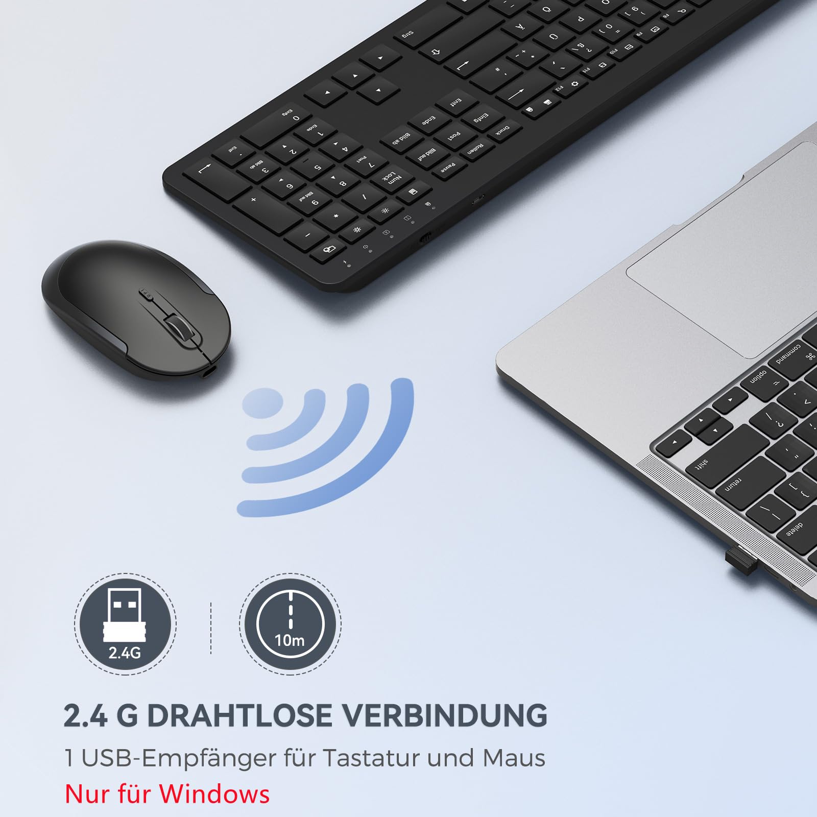 Arbeiten war noch nie so bequem! Dieses seenda Tastatur & Maus Set macht lange Bürotage zum Vergnügen. Die Tastatur hat eine integrierte Handgelenkauflage und verstellbare Ständer für die perfekte Schreibposition. Das deutsche QWERTZ Layout mit Nummernblock und Multimedia-Tasten gibt dir alles, was du brauchst. Die Maus liegt ergonomisch in der Hand und hat 3 DPI-Stufen (800-1200-1600) für präzises Arbeiten. Beide Geräte verbinden sich kabellos über einen USB-Empfänger mit 10m Reichweite - Plug & Play, keine Treiber nötig! Superleise Tasten und Mausklicks - perfekt fürs Büro oder Home-Office. Nach 5 Minuten Inaktivität gehen sie in den Energiesparmodus. Beide benötigen je 2 AAA-Batterien (nicht im Lieferumfang). Im Set: Tastatur, Maus, USB-Empfänger (unter der Batterieabdeckung), Handbuch. Sag goodbye zu Kabelchaos und Hallo zu komfortablem Arbeiten!