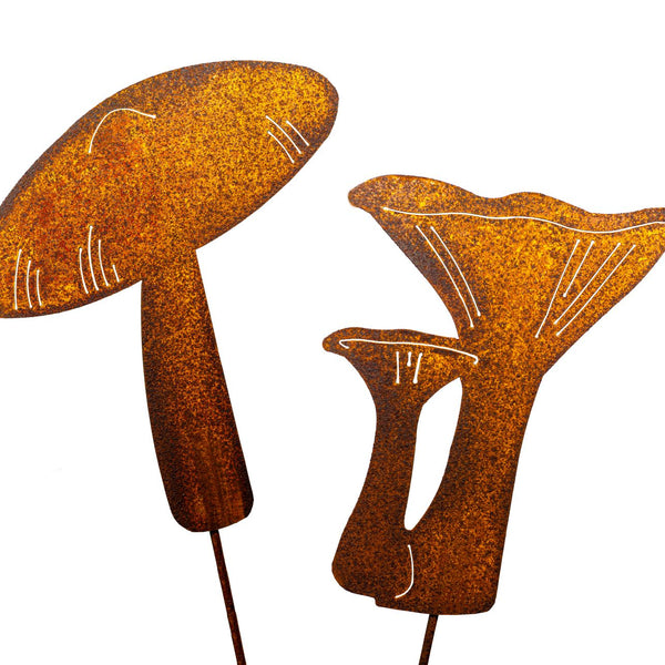 Magst du diesen besonderen Rustic-Look? Dann sind diese rostigen Pilze im 2er Set genau dein Ding! Die Pilze aus Edelrost sehen total natürlich aus und verleihen deinem Garten, Terrasse oder Wohnraum sofort einen besonderen Charme. Mit den 4 mm starken Stäben steckst du sie einfach in die Erde oder einen Blumentopf - schon hast du einen wunderschönen Hingucker! Die Pilze sind ca. 8-14 cm hoch und 10,5 cm breit, aus robustem 1,5 mm dickem Metall. Da sie wetterbeständig sind, kannst du sie das ganze Jahr über draußen lassen. Achtung: Rost kann natürlich abfärben - am besten mit Handschuhen anfassen. Ein tolles Geschenk für alle, die rustikale Deko lieben!