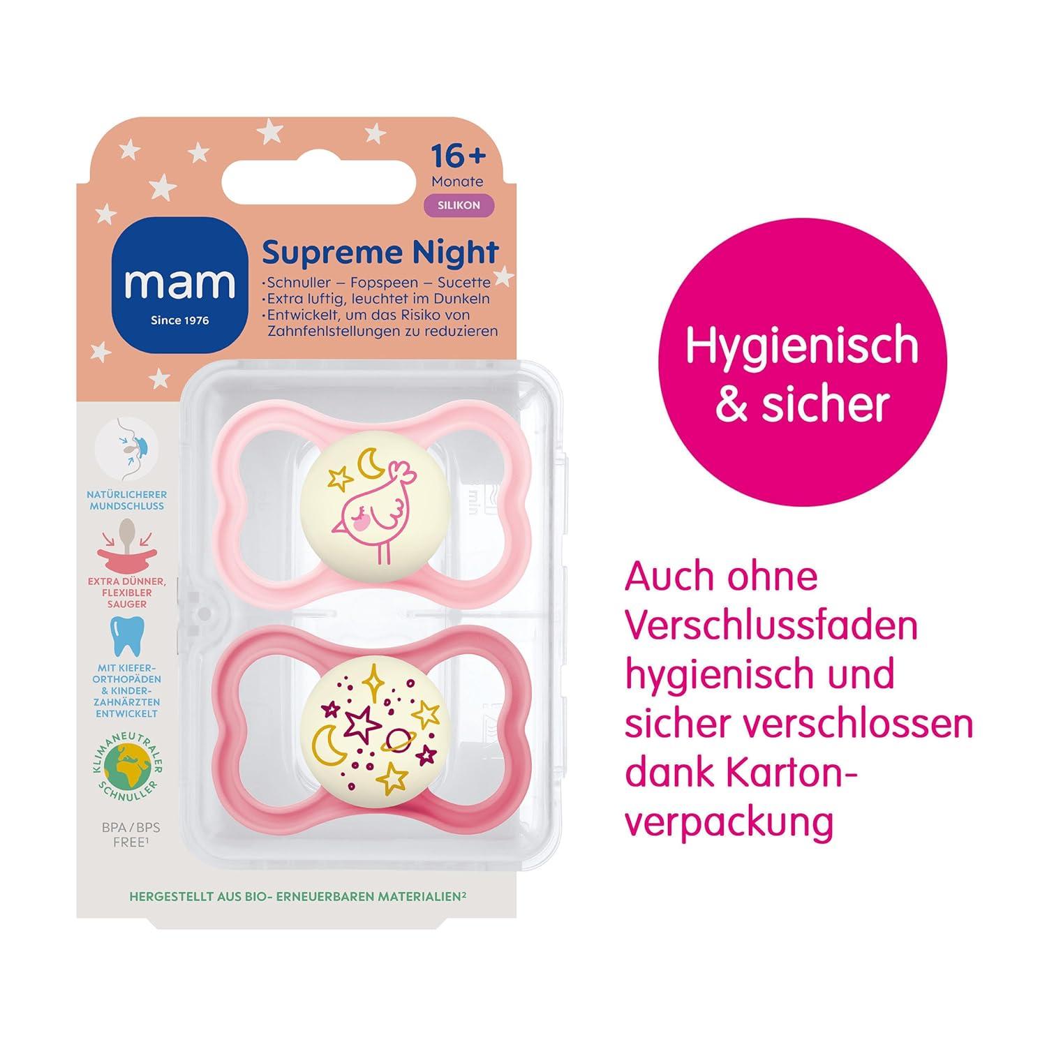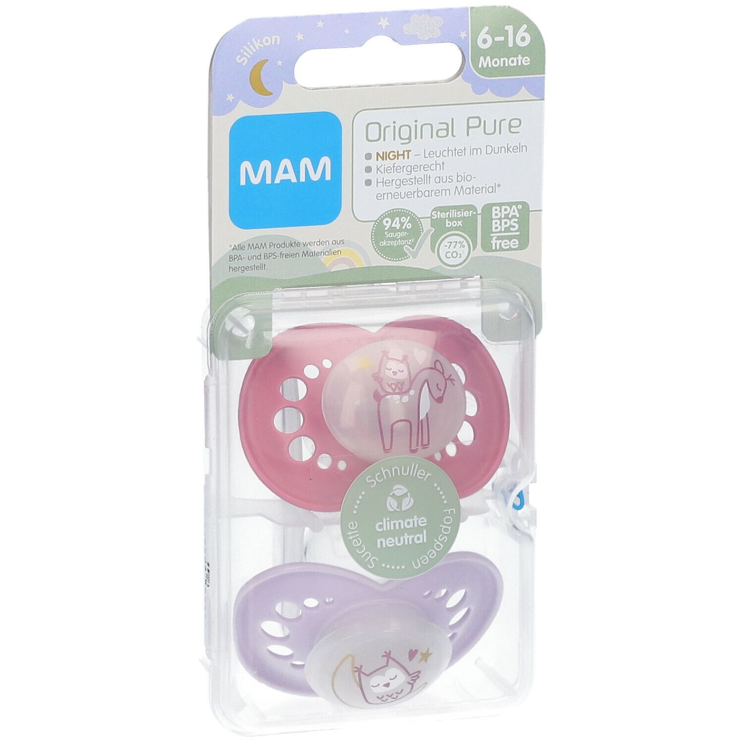 Dieses MAM Schnuller-Set ist einfach perfekt für Babys! 4 Stück im Bundle - davon 2 normale und 2 Night-Versionen die im Dunkeln leuchten. Aus supersoftem SkinSoft Silikon, das 94% der Babys sofort annehmen. Besonders kieferfreundlich durch die symmetrische Form, entwickelt mit Zahnärzten. Das Beste: Schild und Knopf sind aus nachhaltigem, bio-erneuerbarem Material - also klimaneutral! Mit praktischer Sterilisierbox für die Mikrowelle, spart 77% Energie. Für Babys von 6-16 Monaten ideal. BPA/BPS-frei und super hautfreundlich!