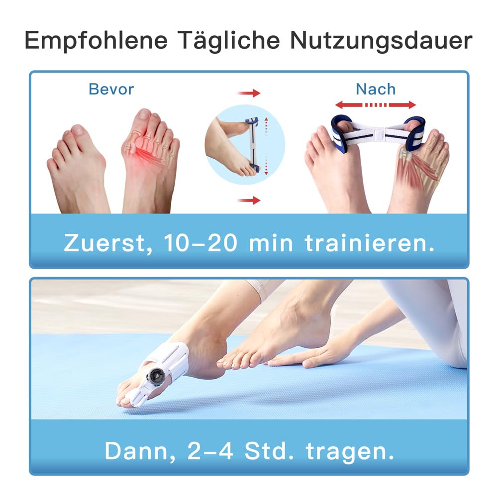 Leidest du unter Ballenzehen? Dieses Komplett-Set könnte dir helfen! Enthalten sind: 2 verstellbare Knopf-Schienen, 4 Silikon-Zehenspreizer und 2 Trainingsbänder. Die Schienen sind für linke und rechte Füße geeignet und universell in der Größe - passt also für Männer und Frauen! Der verstellbare Knopf ermöglicht dir, den Korrekturwinkel genau einzustellen - selbst bei mittelschweren Fällen. Die weichen Silikon-Innenkissen sind bequem und leicht zu reinigen. Du kannst die Schienen tagsüber bei Aktivitäten tragen oder nachts beim Schlafen. Sie helfen nicht nur bei Hallux Valgus, sondern auch bei überlappenden Zehen, Hammerzehen und anderen Fußproblemen. Das Trainingsband unterstützt zusätzlich die Muskulatur. Einfach anlegen, einstellen und tragen - deine Zehen werden es dir danken! Auch zur Vorbeugung super geeignet. Also, gib deinen Füßen die Unterstützung, die sie verdienen!