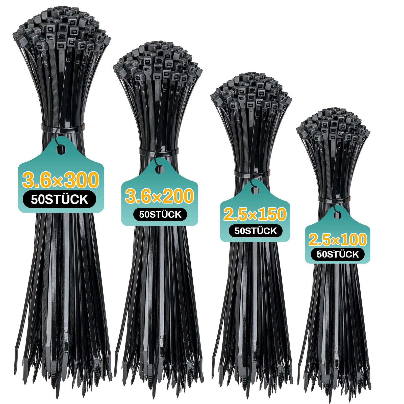 Ordnung muss sein! 📦 Dieses Set enthält 400 schwarze Kabelbinder in 4 Größen: 100mm (8kg Zugfestigkeit), 150mm (18kg), 200mm (18kg), 300mm (18kg). Aus hochwertigem Nylon - UV- und temperaturbeständig. Selbsthemmendes Design für sicheren Halt. Perfekt für Kabelmanagement, Gartenarbeit, Werkstatt, Haushalt. Flexibel und einfach zu verwenden. Für innen und außen geeignet. Bonison Qualität - amerikanische Marke. Hol dir Ordnung in dein Zuhause, Büro oder deine Werkstatt!