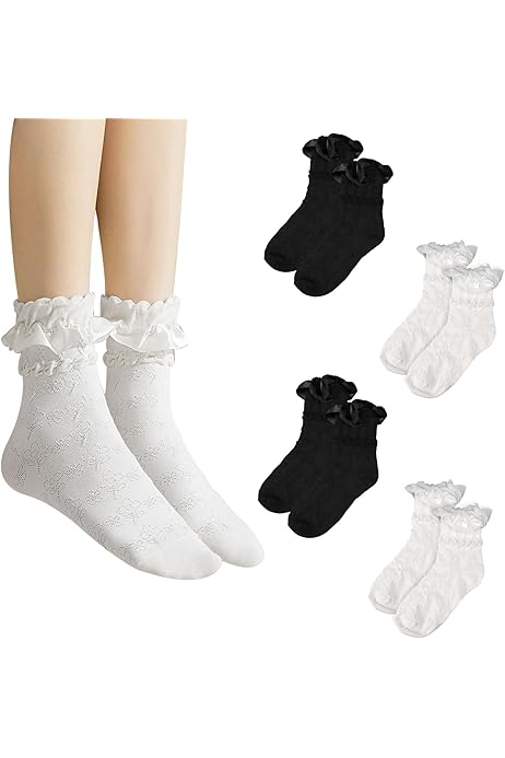 Mädels, diese Socken sind einfach nur süß! 6 Paar im Set - je 2x Schwarz, 2x Weiß, 2x Creme. Mid-Calf Länge, also perfekt für Sneaker oder Stiefeletten. Aus weicher Baumwollmischung - super atmungsaktiv und bequem. Die Rüschen oben sind der absolute Hingucker! Rippstrick sorgt für perfekte Passform - rutscht nicht und sitzt wie angegossen. Total vielseitig kombinierbar - ob casual oder etwas eleganter. Maschinenwaschbar und bleiben auch nach häufigem Waschen in Form. Einfach anziehen und sich wohlfühlen! Perfekt für den Alltag, Büro oder Freizeit. Macht einfach gute Laune!