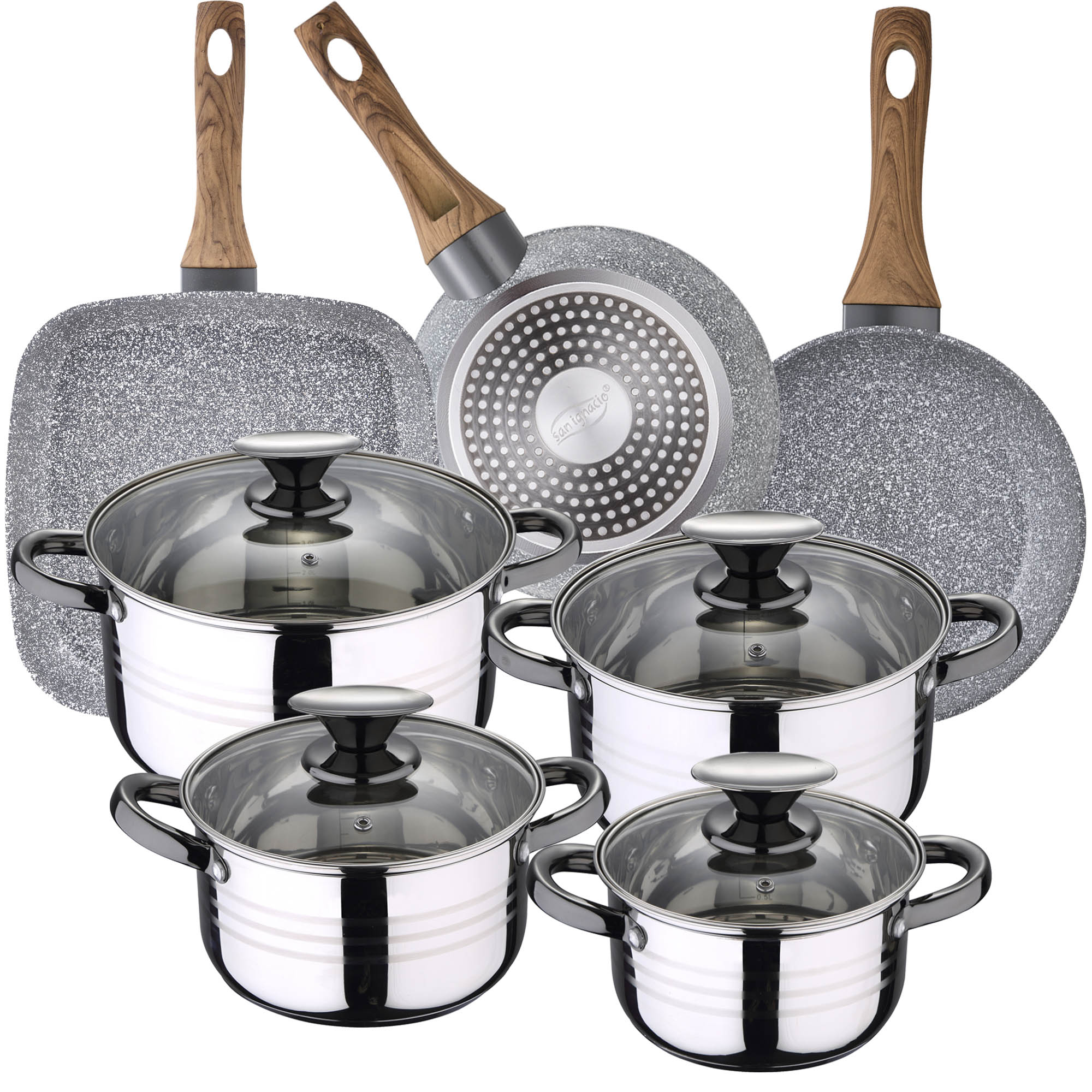 Hey, suchst du ein praktisches Kochset für die Küche oder unterwegs? Dieses ShanSon 6-teilige Kochgeschirr-Set ist genau das Richtige! Mit Antihaft-Beschichtung geht nichts mehr an - super einfach zu reinigen! Im Set enthalten: eine 27,7 cm Bratpfanne, ein 27,7 cm Wok, eine 2,5 l Schmorpfanne, zwei Glas-Silikon-Deckel (21,1 cm und 27,2 cm) und ein abnehmbarer Griff. Der abnehmbare Griff ist genial - spart Platz und du kannst damit alle Teile benutzen! Alles ist stapelbar - perfekt für kleine Küchen, Wohnmobile oder Camping-Ausflüge. Das Set ist für Induktion, Gas und alle gängigen Herdarten geeignet. Die Glasdeckel mit Silikonrand sind nicht nur praktisch, sondern sehen auch noch gut aus. Einfach ein komplettes Set für alle, die gerne kochen - ob in der heimischen Küche oder auf Reisen. Damit bist du für jede Koch-Situation gerüstet und hast immer das richtige Teil zur Hand!