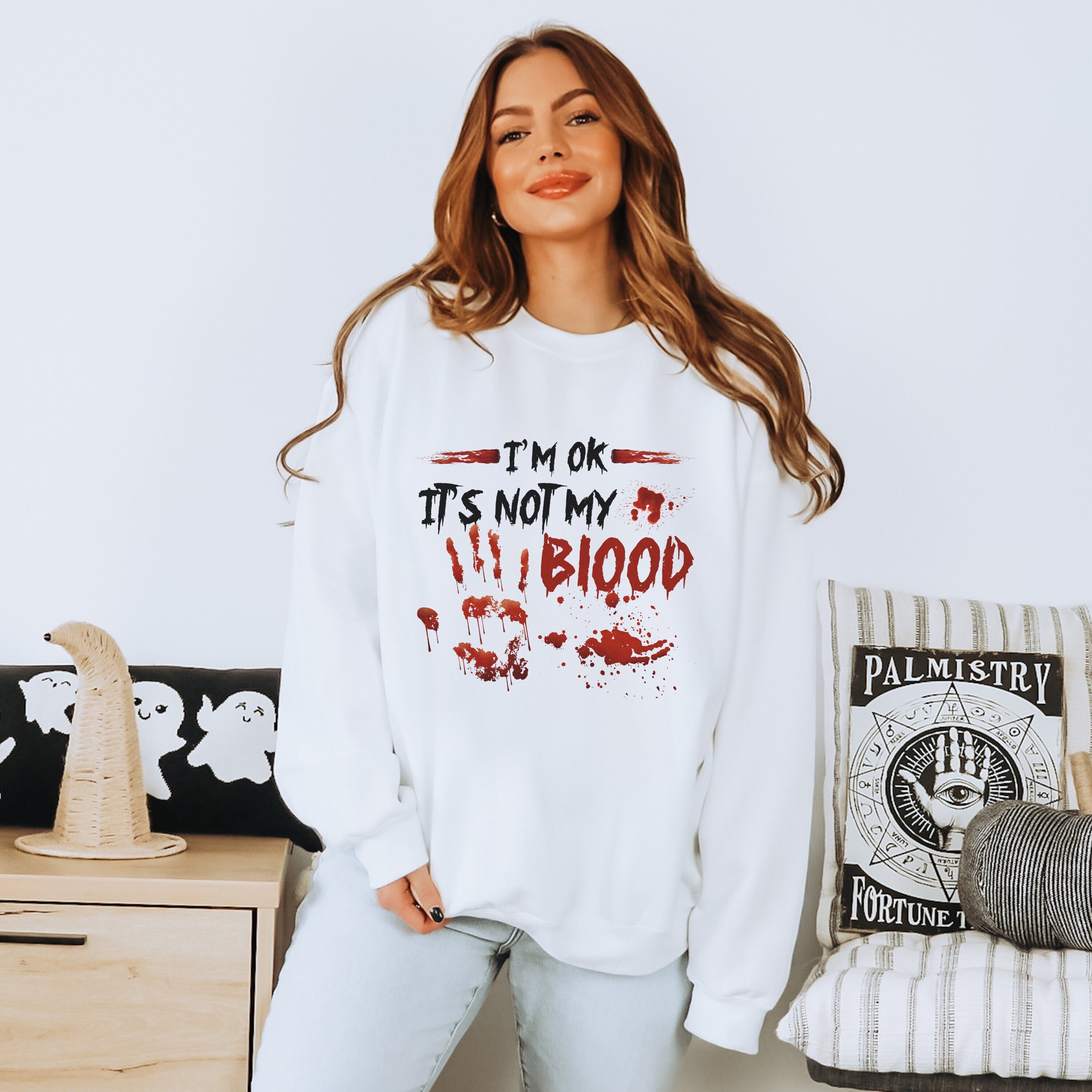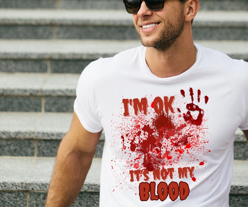 Boom! Mit diesem gruselig-lustigen T-Shirt bist du der Hit auf jeder Halloween-Party! Der Aufdruck 'I'm Ok It's Not My Blood' (Mir geht's gut, das ist nicht mein Blut) sorgt garantiert für Lacher und gruselige Blicke! Das T-Shirt mit V-Ausschnitt und kurzärmeligem Design ist super bequem und passt perfekt unter Kostüme oder als eigenständiges Halloween-Outfit. Aus weicher Baumwolle gefertigt, fühlt sich das Shirt angenehm auf der Haut an und ist ideal für lange Partynächte. Perfekt für Herren, die mit schwarzem Humor punkten wollen! Ob alleine oder als Teil einer Gruppen-Kostümierung - dieses Shirt macht immer eine gute Figur. Kombiniere es mit blutigen Accessoires für den ultimativen Grusel-Effekt oder trag es lässig zur Jeans für den Alltag. Das coole Design kommt bei Jugendlichen und Erwachsenen gleichermaßen gut an! Ein Must-Have für Halloween, Horror-Conventions, Grusel-Partys oder einfach für alle, die makaberen Humor lieben! Bestell jetzt und sei der Grusel-König auf der nächsten Party!