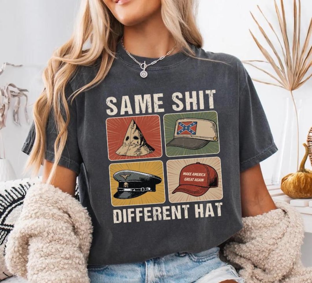 Für alle, die's mit Humor nehmen! Dieses 'Same Shit Different Hat' T-Shirt ist perfekt für alle, die politischen und gesellschaftlichen Wahnsinn mit einem Augenzwinkern sehen. Das marineblaue Shirt aus weichem Baumwollmaterial fühlt sich super an auf der Haut.